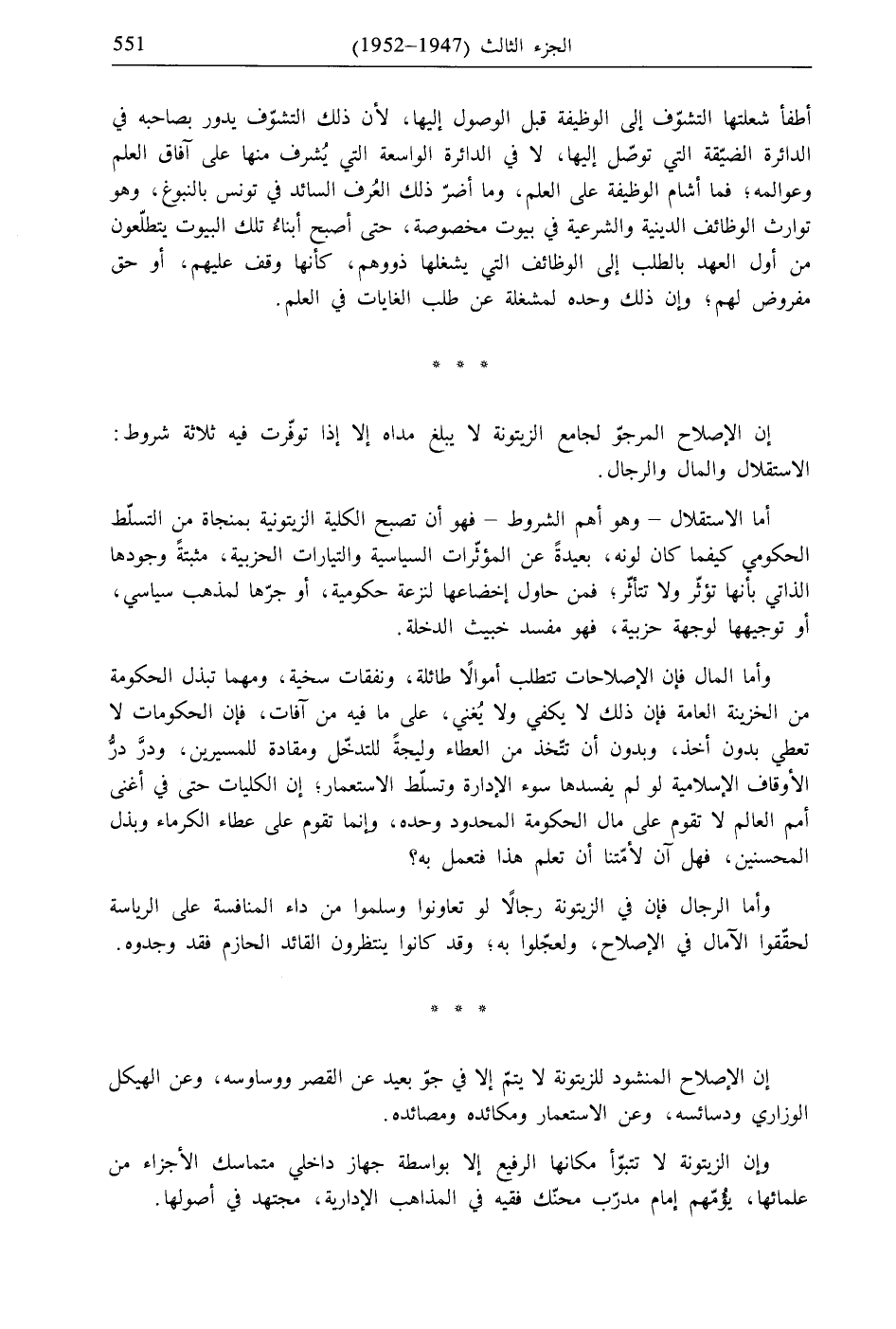 أما الاستقلال- وهو أهم الشروط- فهو أن تصبح الكلية الزيتونية بمنجاة من التسلّط الحكومي كيفما كان لونه، بعيدةً عن المؤثّرات السياسية والتيارات الحزبية، مثبتةً وجودها الذاتي بأنها تؤثّر ولا تتأثّر؛ فمن حاول إخضاعها لنزعة حكومية، أو جرّها لمذهب سياسي، أو توجيهها لوجهة حزبية، فهو مفسد خبيث الدخلة.