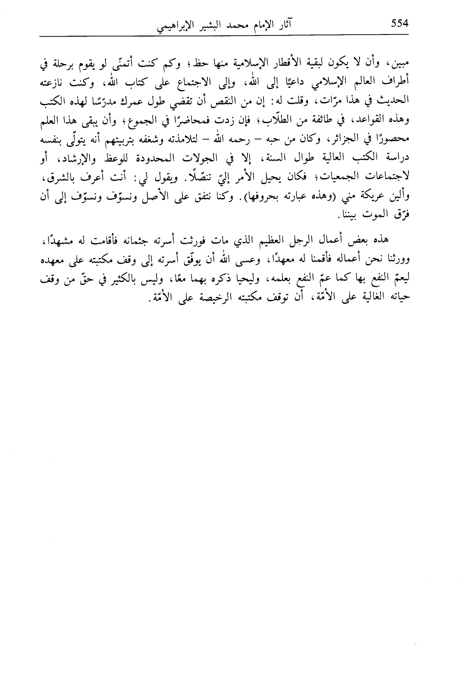 مبين، وأن لا يكون لبقية الأقطار الإسلامية منها حظ؛ وكم كنت أتمنّى لو يقوم برحلة في أطراف العالم الإسلامي داعيًا إلى الله، وإلى الاجتماع على كتاب الله، وكنت نازعته الحديث في هذا مرّات، وقلت له: إن من النقص أن تقضي طول عمرك مدرّسًا لهذه الكتب وهذه القواعد، في طائفة من الطلّاب؛ فإن زدت فمحاضرًا في الجموع، وأن يبقى هذا العلم محصورًا في الجزائر، وكان من حبه- رحمه الله- لتلامذته وشغفه بتربيتهم أنه يتولّى بنفسه دراسة الكتب العالية طوال السنة، إلا في الجولات المحدودة للوعظ والإرشاد، أو لاجتماعات الجمعيات، فكان يحيل الأمر إليّ تنضلًا. ويقول لي: أنت أعرف بالشرق، وألين عريكة مني (وهذه عبارته بحروفها). وكنا نتفق على الأصل ونسوّف ونسوّف إلى أن فرّق الموت بيننا.
