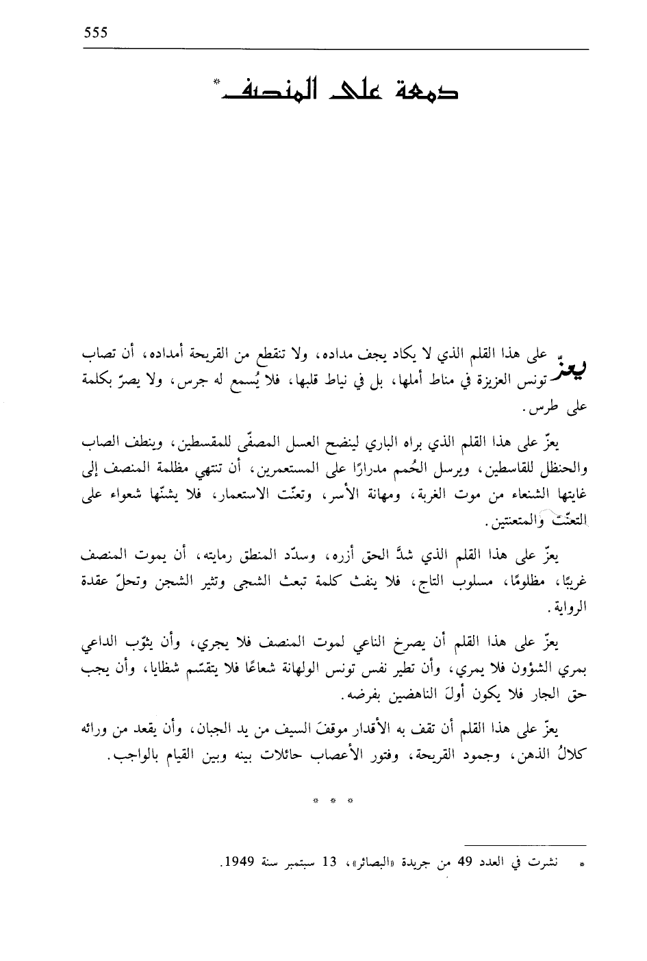يعزّ على هذا القلم أن يصرخ الناعي لموت المنصف فلا يجري، وأن يثوّب الداعي بمري الشؤون فلا يمري، وأن تطير نفس تونس الولهانة شعاعًا فلا يتقسّم شظايا، وأن يجب حق الجار فلا يكون أولَ الناهضين بفرضه.