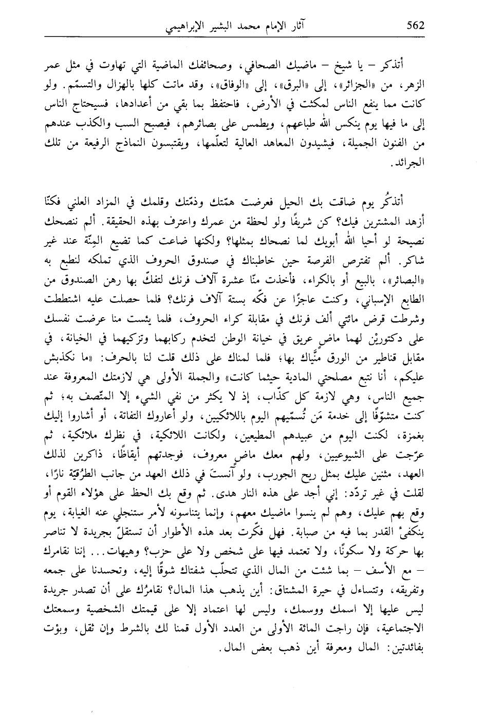 أتذكر- يا شيخ- ماضيك الصحافي، وصحائفك الماضية التي تهاوت في مثل عمر الزهر، من "الجزائر"، إلى "البرق"، إلى "الوفاق"، وقد ماتت كلها بالهزال والتسمّم. ولو كانت مما ينفع الناس لمكثت في الأرض، فاحتفظ بما بقي من أعدادها، فسيحتاج الناس إلى ما فيها يوم ينكس الله طباعهم، ويطمس على بصائرهم، فيصبح السب والكذب عندهم من الفنون الجميلة، فيشيدون المعاهد العالية لتعلّمها، ويقتبسون النماذج الرفيعة من تلك الجرائد.