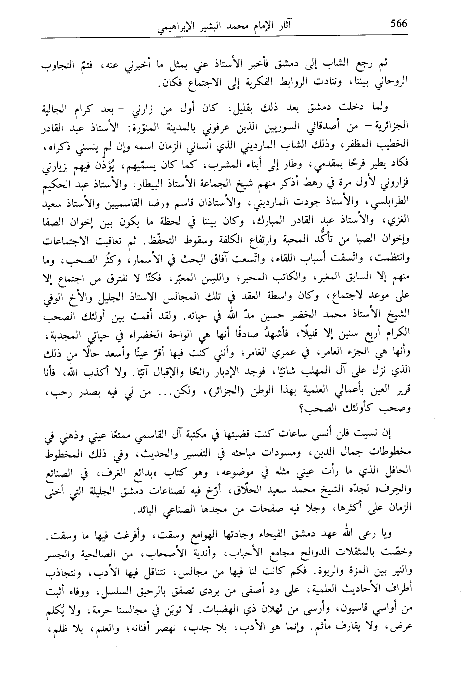 ولما دخلت دمشق بعد ذلك بقليل، كان أول من زارني- بعد كرام الجالية الجزائرية- من أصدقائي السوريين الذين عرفوني بالمدينة المنوّرة: الأستاذ عبد القادر الخطيب المظفر، وذلك الشاب المارديني الذي أنساني الزمان اسمه وإن لم لينسني ذكراه، فكاد يطير فرحًا بمقدمي، وطار إلى أبناء المشرب، كما كان يسمّيهم، يؤذن فيهم بزيارتي فزاروني لأول مرة في رهط أذكر منهم شيخ الجماعة الأستاذ البيطار، والأستاذ عبد الحكيم الطرابلسي، والأستاذ جودت المارديني، والأستاذان قاسم ورضا القاسميين والأستاذ سعيد الغزي، والأستاذ عبد القادر المبارك، وكان بيننا في لحظة ما يكون بين إخوان الصفا وإخوان الصبا من تأكُّد المحبة وارتفاع الكلفة وسقوط التحفّظ. ثم تعاقبت الاجتماعات وانتظمت، واتّسقت أسباب اللقاء، واتّسعت آفاق البحث في الأسمار، وكثُر الصحب، وما منهم إلا السابق المغبر، والكاتب المحبر، واللسِن المعبّر، فكنّا لا نفترق من اجتماع إلا على موعد لاجتماع، وكان واسطة العقد في تلك المجالس الأستاذ الجليل والأخ الوفي الشيخ الأستاذ محمد الخضر حسين مدّ الله في حياته. ولقد أقمت بين أولئك الصحب الكرام أربع سنين إلا قليلًا، فأشهدُ صادقًا أنها هي الواحة الخضراء في حياتي المجدبة، وأنها هي الجزء العامر، في عمري الغامر؛ وأني كنت فيها أقرّ عينًا وأسعد حالًا من ذلك الذي نزل على آل المهلب شاتيًا، فوجد الإدبار رائحًا والإقبال آليًا. ولا أكذب الله، فأنا قرير العين بأعمالي العلمية بهذا الوطن (الجزائر)، ولكن ... من لي فيه بصدر رحب، وصحب كأولئك الصحب؟