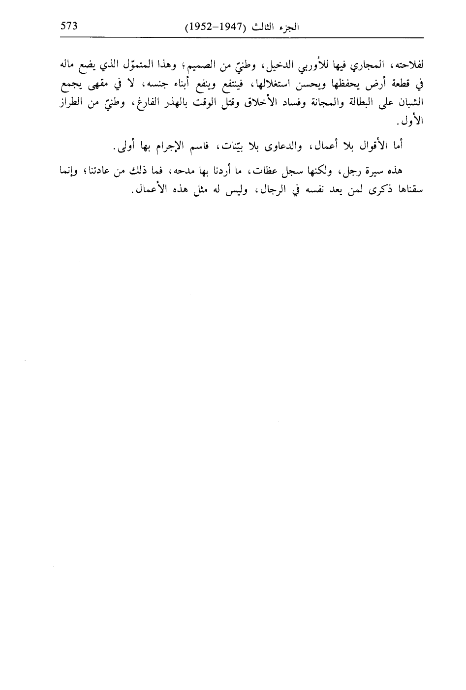 لفلاحته، المجاري فيها للأوربي الدخيل، وطنيّ من الصميم، وهذا المتموّل الذي يضع ماله في قطعة أرض يحفظها ويحسن استغلالها، فينتفع وينفع أبناء جنسه، لا في مقهى يجمع الشبان على البطالة والمجانة وفساد الأخلاق وقتل الوقت بالهذر الفارغ، وطنيّ من الطراز الأول.