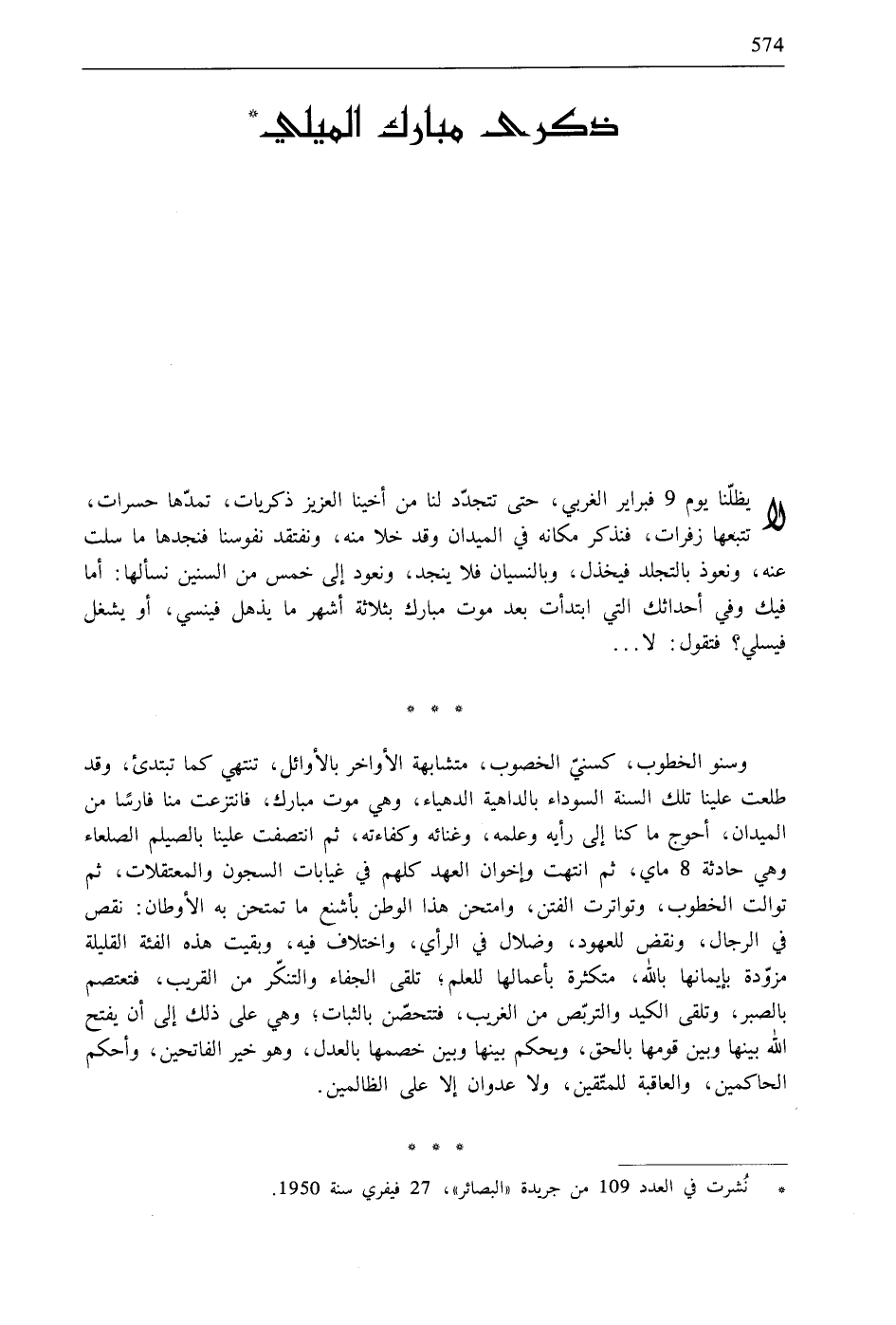 وسنو الخطوب، كسنيّ الخصوب، متشابهة الأواخر بالأوائل، تنتهي كما تبتدئ، وقد طلعت علينا تلك السنة السوداء بالداهية الدهياء، وهي موت مبارك، فانتزعت منا فارسًا من الميدان، أحوج ما كنا إلى رأيه وعلمه، وغنائه وكفاءته، ثم انتصفت علينا بالصيلم الصلعاء وهي حادثة 8 ماي، ثم انتهت وإخوان العهد كلهم في غيابات السجون والمعتقلات، ثم توالت الخطوب، وتواترت الفتن، وامتحن هذا الوطن بأشنع ما تمتحن به الأوطان: نقص في الرجال، ونقض للعهود، وضلال في الرأي، واختلاف فيه، وبقيت هذه الفئة القليلة مزوّدة بإيمانها بالله، متكثرة بأعمالها للعلم، تلقى الجفاء والتنكّر من القريب، فتعتصم بالصبر، وتلقى الكيد والتربّص من الغريب، فتتحصّن بالثبات؛ وهي على ذلك إلى أن يفتح الله بينها وبين قومها بالحق، ويحكم بينها وبين خصمها بالعدل، وهو خير الفاتحين، وأحكم الحاكمين، والعاقبة للمتّقين، ولا عدوان إلا على الظالمين.