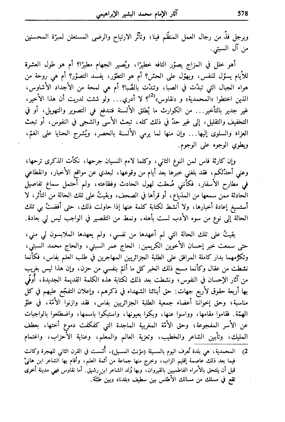 بقيتُ على تلك الحالة التي لم أعهدها من نفسي، ولم يعهدها الملابسون لي مني، حتى سمعت خبر إحسان الأخوين الكريمين: الحاج عمر السبتي، والحاج محمد السبتي، وتكرُّمهما بدار كاملة المرافق على الطلبة الجزائريين المهاجرين في طلب العلم بفاس، فكأنما نشطت من عقال وكأنما مسح ذلك الخبر كل ما ألمّ بنفسي من حزن، وإن هذا ليس بغريب من آثار الإحسان في النفوس؛ ونشطت بعد ذلك لكتابة هذه الكلمة القديمة الجديدة، أُوفّي بها أربعة حقوق لأربع جهات: حق أبنائنا الشهداء في ذكرهم، وإعلان التفجّع عليهم في كل مناسبة؛ وحق إخواننا أعضاء جمعية الطلبة الجزائريين بفاس، فقد وازنوا الأمّة، في علوّ الهمّة. فقاموا مقامها، وواسوا عنها، وبكوا بعيونها، واستبكوا باسمها، واضطلعوا بالواجبات عن الأسر المفجوعة؛ وحق الأمّة المغربية الماجدة التي كفكفت دموع أختها، بعطف المليك، وتأبين الشاعر والخطيب، وتعزية العالم والمعلم، وعناية الأحزاب، واغتمام