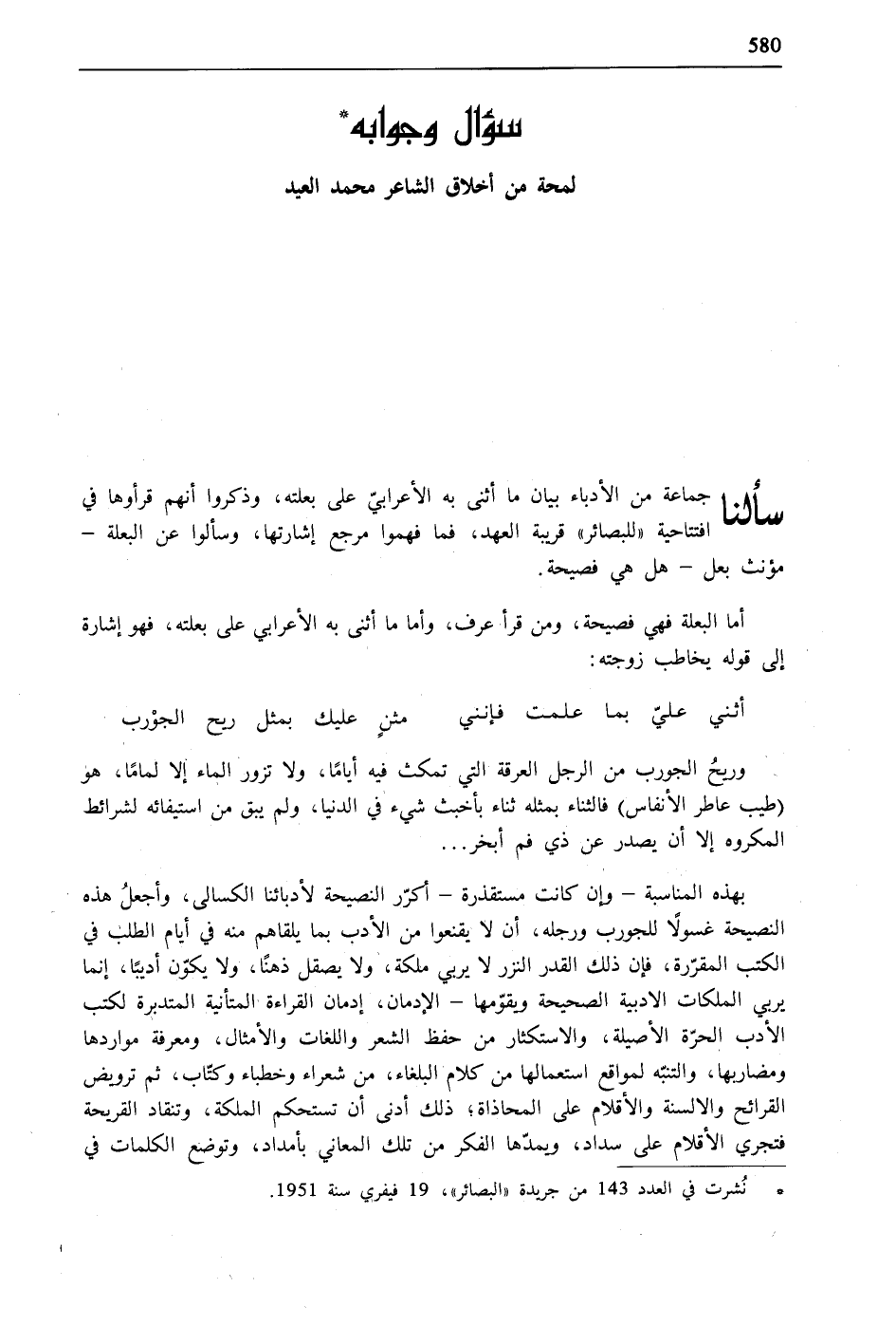 سألنا جماعة من الأدباء بيان ما أثنى به الأعرابيّ على بعلته، وذكروا أنهم قرأوها في افتتاحية "للبصائر" قريبة العهد، فما فهموا مرجع إشارتها، وسألوا عن البعلة- مؤنث بعل- هل هي فصيحة.