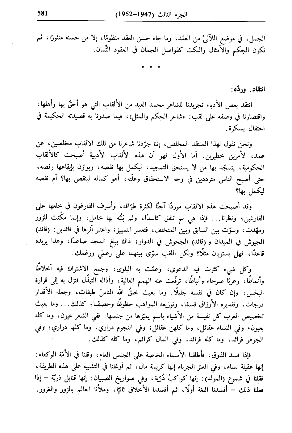 ونحن نقول لهذا المنتقد المخلص، إننا جرّدنا شاعرنا من تلك الألقاب مخلصين، عن عمد، لأمرين خطيرين. أما الأول فهو أن هذه الألقاب الأدبية أصبحت كالألقاب الحكومية، يتمجّد بها من لا يستحق التمجيد، ليكمل بها نقصه، ويوازن بإيقاعها رقصه، حتى أصبح الناس مترددين في وجه الاستحقاق وعلّته، أهو كماله لينقص بها؟ أم نقصه ليكمل بها؟