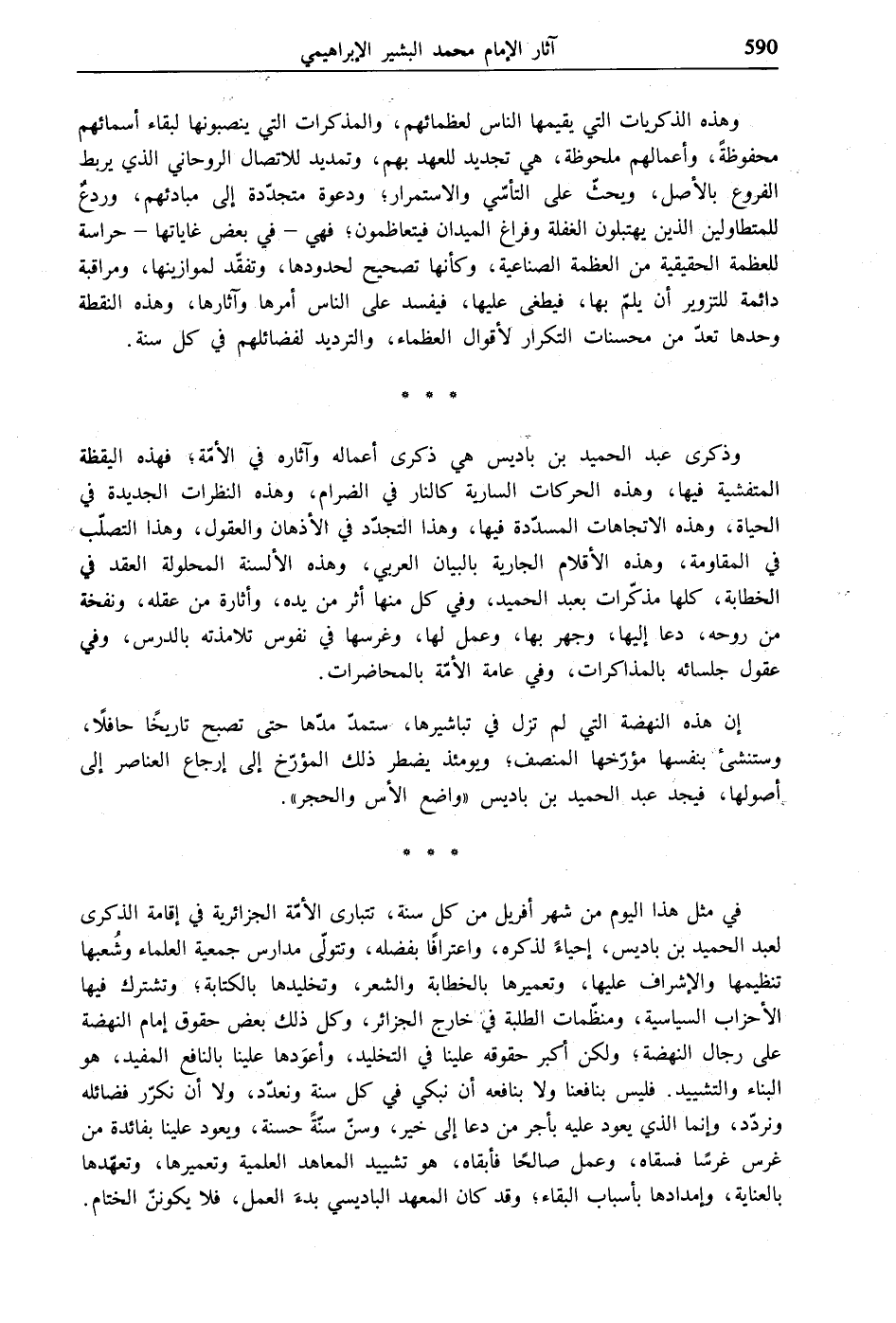 وذكرى عبد الحميد بن باديس هي ذكرى أعماله وآثاره في الأمّة، فهذه اليقظة المتفشية فيها، وهذه الحركات السارية كالنار في الضرام، وهذه النظرات الجديدة في الحياة، وهذه الاتجاهات المسدّدة فيها، وهذا التجدّد في الأذهان والعقول، وهذا التصلّب في المقاومة، وهذه الأقلام الجارية بالبيان العربي، وهذه الألسنة المحلولة العقد في الخطابة، كلها مذكّرات بعبد الحميد، وفي كل منها أثر من يده، وأثارة من عقله، ونفخة من روحه، دعا إليها، وجهر بها، وعمل لها، وغرسها في نفوس تلامذته بالدرس، وفي عقول جلسائه بالمذاكرات، وفي عامة الأمّة بالمحاضرات.