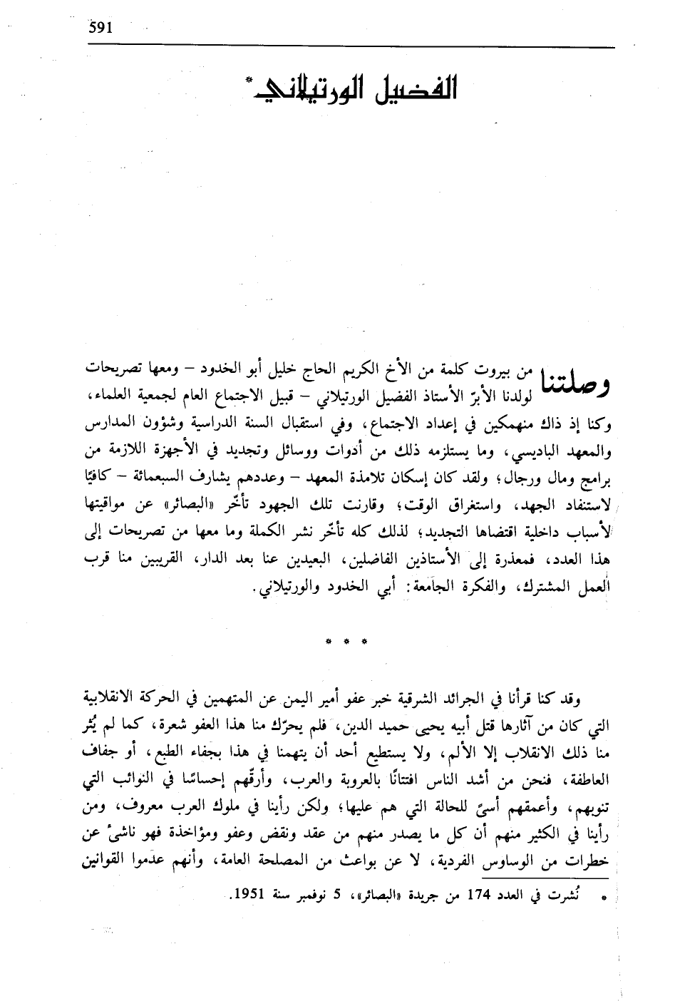 وصلتنا من بيروت كلمة من الأخ الكريم الحاج خليل أبو الخدود- ومعها تصريحات لولدنا الأبرّ الأستاذ الفضيل الورتيلانى- قبيل الاجتماع العام لجمعية العلماء، وكنا إذ ذاك منهمكين في إعداد الاجتماع، وفي استقبال السنة الدراسية وشؤون المدارس والمعهد الباديسي، وما يستلزمه ذلك من أدوات ووسائل وتجديد في الأجهزة اللازمة من برامج ومال ورجال، ولقد كان إسكان تلامذة المعهد- وعددهم يشارف السبعمائة- كافيًا لاستنفاد الجهد، واستغراق الوقت، وقارنت تلك الجهود تأخّر «البصائر» عن مواقيتها لأسباب داخلية اقتضاها التجديد، لذلك كله تأخّر نشر الكملة وما معها من تصريحات إلى هذا العدد، فمعذرة إلى الأستاذين الفاضلين، البعيدين عنا بعد الدار، القريبين منا قرب العمل المشترك، والفكرة الجامعة: أبي الخدود والورتيلاني.