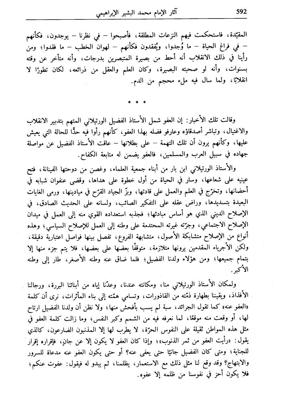 ولمكان الأستاذ الورتيلاني منا، ومكانته عندنا، وعدّنا إياه من أبنائنا البررة، ورجالنا الأفذاذ، ويقيننا بطهارة ذمّته من القاذورات، وتسامي همّته إلى بناء المأثرات، نرى أن كلمة "العفو عنه" كما تقول الجرائد، سبة لم يسب بأفحش منها، ولا نظن أن ولدنا الفضيل ارتاح لها، أو وقعت منه موقعًا، لما نعرفه فيه من الشمم وكبر النفس، وما زالت كلمة العفو في مثل هذه المواطن ثقيلة على النفوس الحرّة، لا يطرب لها إلا المذنبون الضارعون، كالذي يقول: "رأيت العفو من ثمر الذنوب"، وإذا كان العفو لا يكون إلا عن جانٍ، فإقراره إقرار للجناية، ومتى كان الفضيل جانيًا حتى يعفى عنه؟ أو حتى يكون العفو عنه مدعاة للسرور والابتهاج؟ وقد وقع لنا مثل ذلك مع الاستعمار، يظلمنا، ثم يبدو له فيقول: عفوت عنكم، فلا يكون أحز في نفوسنا من ظلمه إلا عفوه.