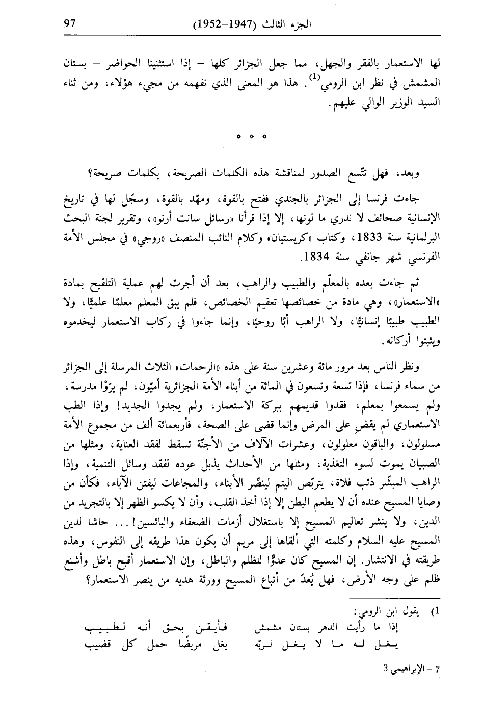 ونظر الناس بعد مرور مائة وعشرين سنة على هذه "الرحمات" الثلاث المرسلة إلى الجزائر من سماء فرنسا، فإذا تسعة وتسعون في المائة من أبناء الأمة الجزائرية أميّون، لم يرَوْا مدرسة، ولم يسمعوا بمعلم، فقدوا قديمهم ببركة الاستعمار، ولم يجدوا الجديد! وإذا الطب الاستعماري لم يقضِ على المرض وإنما قضى على الصحة، فأربعمائة ألف من مجموع الأمة مسلولون، والباقون معلولون، وعشرات الآلاف من الأجنّة تسقط لفقد العناية، ومثلها من الصبيان يموت لسوء التغذية، ومثلها من الأحداث يذبل عوده لفقد وسائل التنمية، وإذا الراهب المبشّر ذئب فلاة، يتربّص اليتم لينصِّر الأبناء، والمجاعات ليفتن الآباء، فكأن من وصايا المسيح عنده أن لا يطعم البطن إلا إذا أخذ القلب، وأن لا يكسو الظهر إلا بالتجريد من الدين، ولا ينشر تعاليم المسيح إلا باستغلال أزمات الضعفاء والبائسين! ... حاشا لدين المسيح عليه السلام وكلمته التي ألقاها إلى مريم أن يكون هذا طريقه إلى النفوس، وهذه طريقته في الانتشار. إن المسيح كان عدوًّا للظلم والباطل، وإن الاستعمار أقبح باطل وأشنع ظلم على وجه الأرض، فهل يُعدّ من أتباع المسيح وورثة هديه من ينصر الاستعمار؟