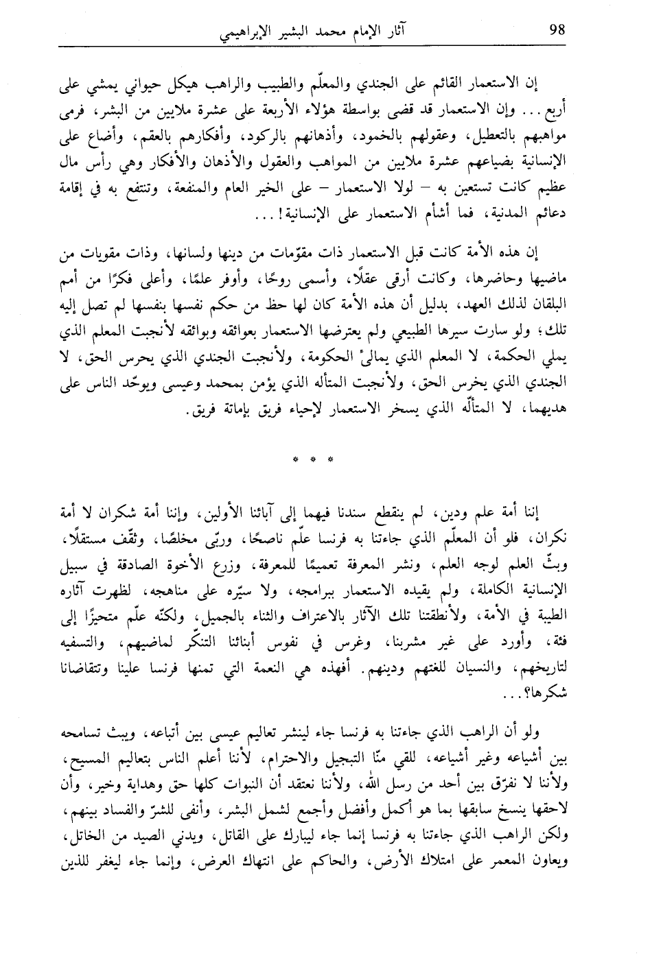 إننا أمة علم ودين، لم ينقطع سندنا فيهما إلى آبائنا الأولين، وإننا أمة شكران لا أمة نكران، فلو أن المعلّم الذي جاءتنا به فرنسا علّم ناصحًا، وربّى مخلصًا، وثقّف مستقلًا، وبثّ العلم لوجه العلم، ونشر المعرفة تعميمًا للمعرفة، وزرع الأخوة الصادقة في سبيل الإنسانية الكاملة، ولم يقيده الاستعمار ببرامجه، ولا سيّره على مناهجه، لظهرت آثاره الطيبة في الأمة، ولأنطقتنا تلك الآثار بالاعتراف والثناء بالجميل، ولكنّه علّم متحيزًا إلى فئة، وأورد على غير مشربنا، وغرس في نفوس أبنائنا التنكّر لماضيهم، والتسفيه لتاريخهم، والنسيان للغتهم ودينهم. أفهذه هي النعمة التي تمنها فرنسا علينا وتتقاضانا شكرها؟ ...