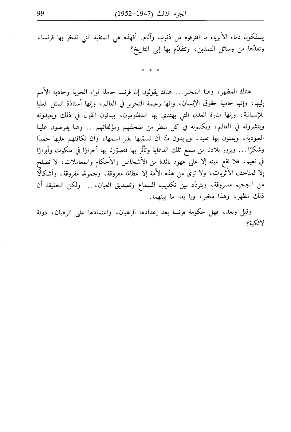 هناك المظهر، وهنا المخبر ... هناك يقولون إن فرنسا حاملة لواء الحرية وحادية الأمم إليها، وإنها حامية حقوق الإنسان، وإنها زعيمة التحرير في العالم، وإنها أستاذة المثل العليا للإنسانية، وإنها منارة العدل التي يهتدي بها المظلومون، يبدئون القول في ذلك ويعيدونه وينشرونه في العالم، ويكتبونه في كل سطر من صحفهم ومؤلفاتهم ... وهنا يفرضون علينا العبودية، ويمنون بها علينا، ويريدون منّا أن نسمّيها بغير اسمها، وأن نكافئهم عليها حمدًا وشكرًا ... ويزور بلادنا من سمع تلك الدعاية وتأثّر بها فتصوّرنا بها أحرارًا في ملكوت وأبرارًا في نعيم، فلا تقع عينه إلا على عهود بائدة من الأشخاص والأحكام والمعاملات، لا تصلح إلا لمتاحف الأثريات، ولا ترى من هذه الأمة إلا عظامًا معروقة، وجموعًا مفروقة، وأشكالًا من الجحيم مسروقة، ويتردّد بين تكذيب السماع وتصديق العيان، ... ولكن الحقيقة أن ذلك مظهر، وهذا مخبر، ويا بعد ما بينهما.