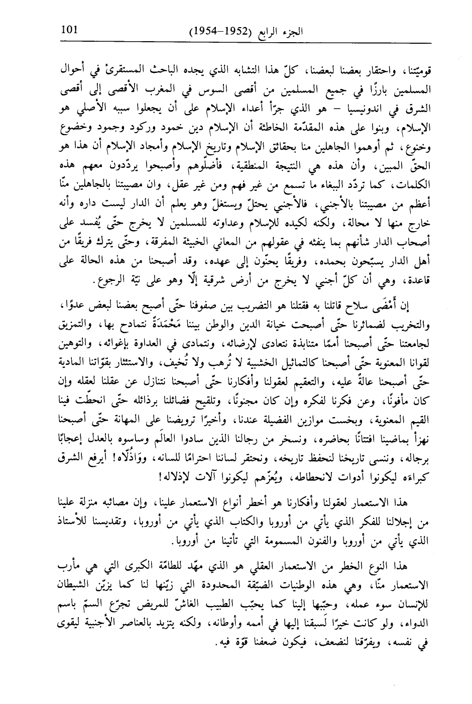 قوميّتنا، واحتقار بعضنا لبعضنا، كلّ هذا التشابه الذي يجده الباحث المستقرئ في أحوال المسلمين بارزًا في جميع المسلمين من أقصى السوس في المغرب الأقصى إلى أقصى الشرق في أندونيسيا- هو الذي جرّأ أعداء الإسلام على أن يجعلوا سببه الأصلي هو الإسلام، وبنوا على هذه المقدّمة الخاطئة أن الإسلام دين خمود وركود وجمود وخضوع وخنوع، ثم أوهموا الجاهلين منا بحقائق الإسلام وتاريخ الإسلام وأمجاد الإسلام أن هذا هو الحق المبين، وأن هذه هي النتيجة المنطقية، فأضلّوهم وأصبحوا يردّدون معهم هذه الكلمات، كما تردّد الببغاء ما تسمع من غير فهم ومن غير عقل، وان مصيبتنا بالجاهلين منا أعظم من مصيبتنا بالأجنبي، فالأجنبي يحتلّ ويستغلّ وهو يعلم أن الدار ليست داره وأنه خارج منها لا محالة، ولكنه لكيده للإسلام وعداوته للمسلمين لا يخرج حتّى يفسد على أصحاب الدار شأنهم بما ينفثه في عقولهم من المعاني الخبيثة المفرقة، وحتّى يترك فريقًا من أهل الدار يسبّحون بحمده، وفريقًا يحنّون إلى عهده، وقد أصبحنا من هذه الحالة على قاعدة، وهي أن كلّ أجنبي لا يخرج من أرض شرقية إلا وهو على نيّة الرجوع.