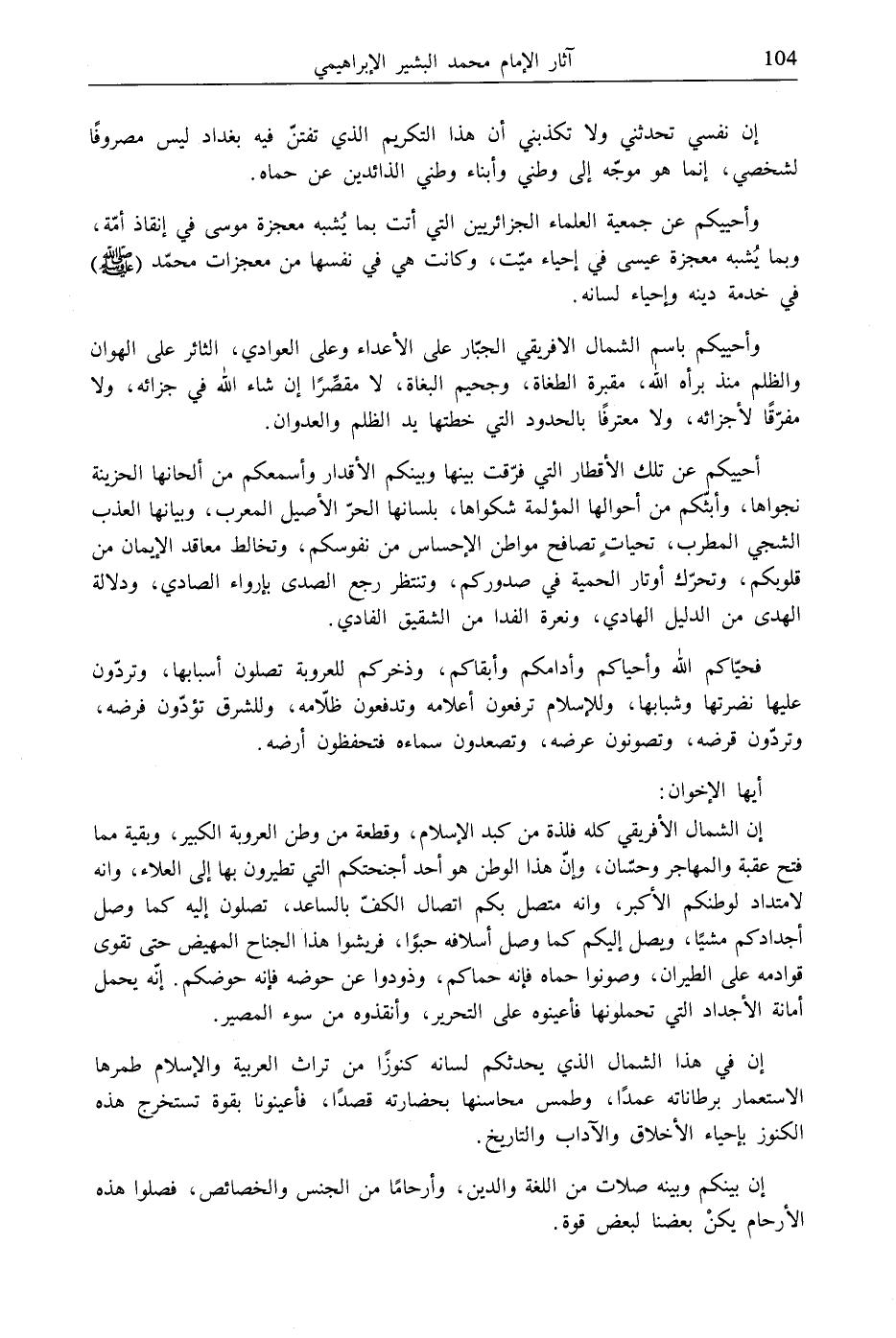 إن الشمال الأفريقي كله فلذة من كبد الإسلام، وقطعة من وطن العروبة الكبير، وبقية مما فتح عقبة والمهاجر وحسّان، وإنّ هذا الوطن هو أحد أجنحتكم التي تطيرون بها إلى العلاء، وانه لامتداد لوطنكم الأكبر، وانه متصل بكم اتصال الكفّ بالساعد، تصلون إليه كما وصل أجدادكم مشيًا، ويصل إليكم كما وصل أسلافه حبوًا، فريشوا هذا الجناح المهيض حتى تقوى قوادمه على الطيران، وصونوا حماه فإنه حماكم، وذودوا عن حوضه فإنه حوضكم. إنّه يحمل أمانة الأجداد التي تحملونها فأعينوه على التحرير، وأنقذوه من سوء المصير.