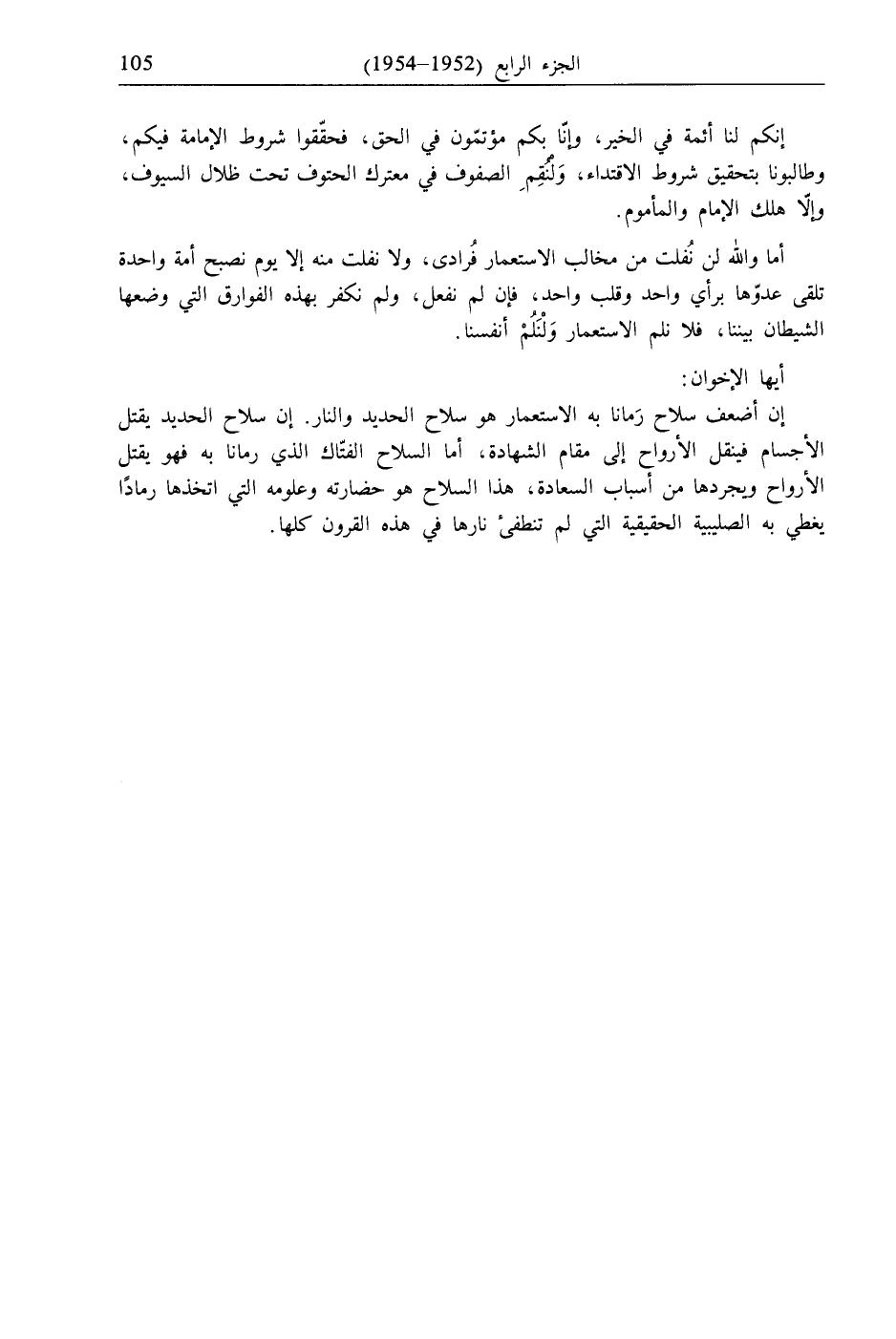 أما والله لن نفلت من مخالب الاستعمار فُرادى، ولا نفلت منه إلا يوم نصبح أمة واحدة تلقى عدوّها برأي واحد وقلب واحد، فإن لم نفعل، ولم نكفر بهذه الفوارق التي وضعها الشيطان بيننا، فلا نلم الاستعمار وَئنَلُمْ أنفسنا.