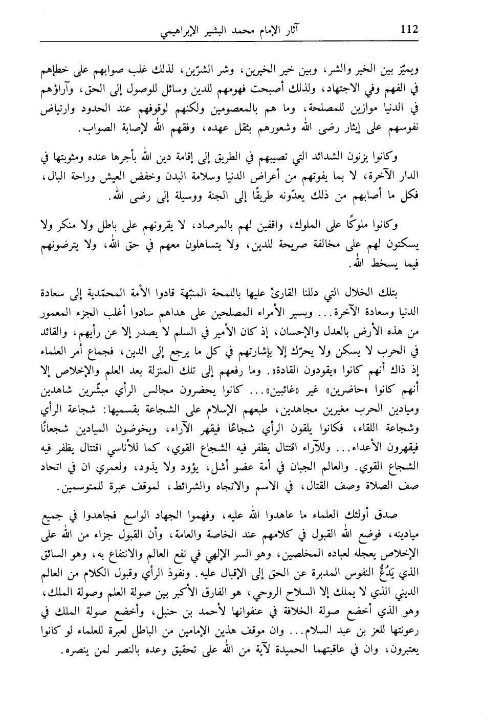 بتلك الخلال التي دللنا القارئ عليها باللمحة المنبّهة قادوا الأمة المحمّدية إلى سعادة الدنيا وسعادة الآخرة ... وبسير الأمراء المصلحين على هداهم سادوا أغلب الجزء المعمور من هذه الأرض بالعدل والإحسان، إذ كان الأمير في السلم لا يصدر إلا عن رأيهم، والقائد في الحرب لا يسكن ولا يحرّك إلا بإشارتهم في كل ما يرجع إلى الدين، فجماع أمر العلماء إذ ذاك أنهم كانوا "يقودون القادة". وما رفعهم إلى تلك المنزلة بعد العلم والإخلاص إلا أنهم كانوا "حاضرين" غير "غائبين" ... كانوا يحضرون مجالس الرأي مبشّرين شاهدين وميادين الحرب مغيرين مجاهدين، طبعهم الإسلام على الشجاعة بقسميها: شجاعة الرأي وشجاعة اللقاء، فكانوا يلقون الرأي شجاعًا فيقهر الآراء، ويخوضون الميادين شجعانًا فيقهرون الأعداء ... وللآراء اقتتال يظفر فيه الشجاع القوي، كما للأناسي اقتتال يظفر فيه الشجاع القوي. والعالم الجبان في أمة عضو أشل، يؤود ولا يذود، ولعمري ان في اتحاد صف الصلاة وصف القتال، في الاسم والاتجاه والشرائط، لموقف عبرة للمتوسمين.