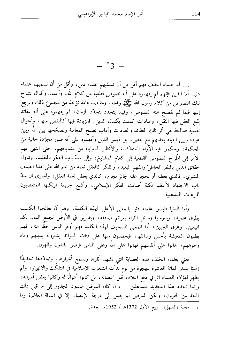 ... أما علماء الخلف فهم أقل من أن تسمّيهم علماء دين، وأقل من أن تسميهم علماء دنيا. أما الدين فإنهم لم يفهموه على أنه نصوص قطعية من كلام الله، وأعمال وأقوال تشرح تلك النصوص من كلام رسول الله - صلى الله عليه وسلم - وفعله، ومقاصد عامة تؤخذ من مجموع ذلك ويرجع إليها فيما لم تفصح عنه النصوص، وفيما يتجدد بتجدّد الزمان، لم يفهموه على أنه عقائد يتّبع العقل فيها النقل، وعبادات كملت بكمال الدين. فالزيادة فيها كالنقص منها، وأحوال نفسية صالحة هي أثر تلك العقائد والعبادات وآداب تصلح المعاملة وتصحّحها بين الله وبين عباده وبين العباد بعضهم مع بعض، بل فهموا الدين وأفهموه على أنه صور مجرّدة خالية من الحكمة، وحكموا فيه الآراء المتعاكسة والأنظار المتباينة من مشايخهم، حتى انتهى بهم الأمر إلى اطّراح النصوص القطعية إلى كلام المشايخ، وإلى سدّ باب الفكر بالتقليد، وتناول حقائق الدين بالنظر الخاطئ والفهم البعيد، والفكر كالعقل نعمة من نعم الله على هذا الصنف البشري، فالذي يعطله أو يحجر عليه جانٍ مجرم، كالذي يعطل نعمة العقل، ولعمري ان سدّ باب الاجتهاد لأعظم نكبة أصابت الفكر الإسلامي، وأشنع جريمة ارتكبها المتعصبون للنزعات المذهبية.