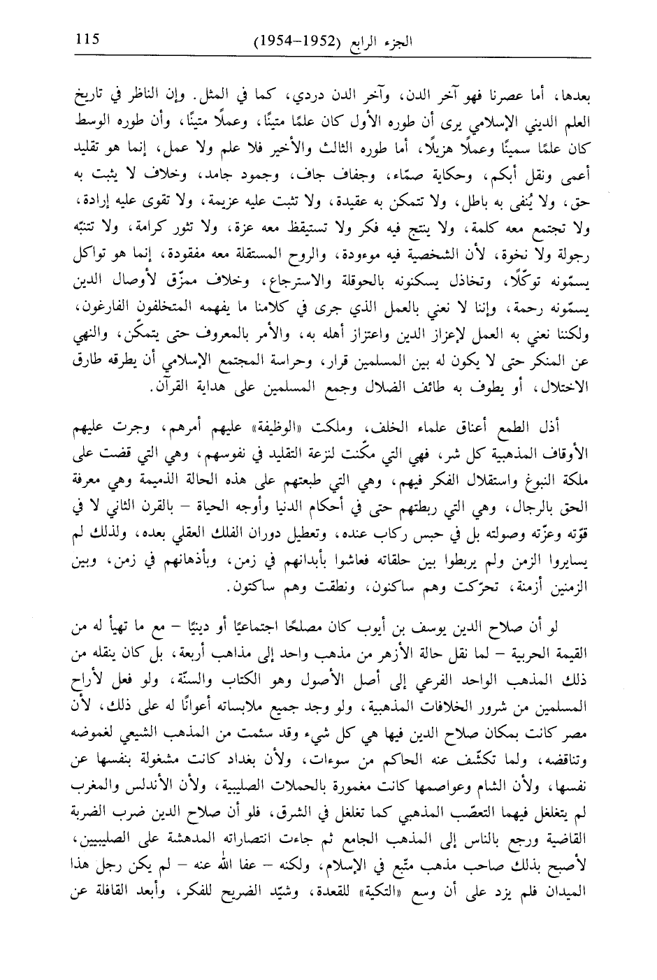 بعدها، أما عصرنا فهو آخر الدن، وآخر الدن دردي، كما في المثل. وإن الناظر في تاريخ العلم الديني الإسلامي يرى أن طوره الأول كان علمًا متينًا، وعملًا متينًا، وأن طوره الوسط كان علمًا سمينًا وعملًا هزيلًا، أما طوره الثالث والأخير فلا علم ولا عمل، إنما هو تقليد أعمى ونقل أبكم، وحكاية صمّاء، وجفاف جاف، وجمود جامد، وخلاف لا يثبت به حق، ولا يُنفى به باطل، ولا تتمكن به عقيدة، ولا تثبت عليه عزيمة، ولا تقوى عليه إرادة، ولا تجتمع معه كلمة، ولا ينتج فيه فكر ولا تستيقظ معه عزة، ولا تثور كرامة، ولا تتنبّه رجولة ولا نخوة، لأن الشخصية فيه موءودة، والروح المستقلة معه مفقودة، إنما هو تواكل يسمّونه توكّلًا، وتخاذل يسكنونه بالحوقلة والاسترجاع، وخلاف ممزّق لأوصال الدين يسمّونه رحمة، وإننا لا نعني بالعمل الذي جرى في كلامنا ما يفهمه المتخلفون الفارغون، ولكننا نعني به العمل لإعزاز الدين واعتزاز أهله به، والأمر بالمعروف حتى يتمكّن، والنهي عن المنكر حتى لا يكون له بين المسلمين قرار، وحراسة المجتمع الإسلامي أن يطرقه طارق الاختلال، أو يطوف به طائف الضلال وجمع المسلمين على هداية القرآن.