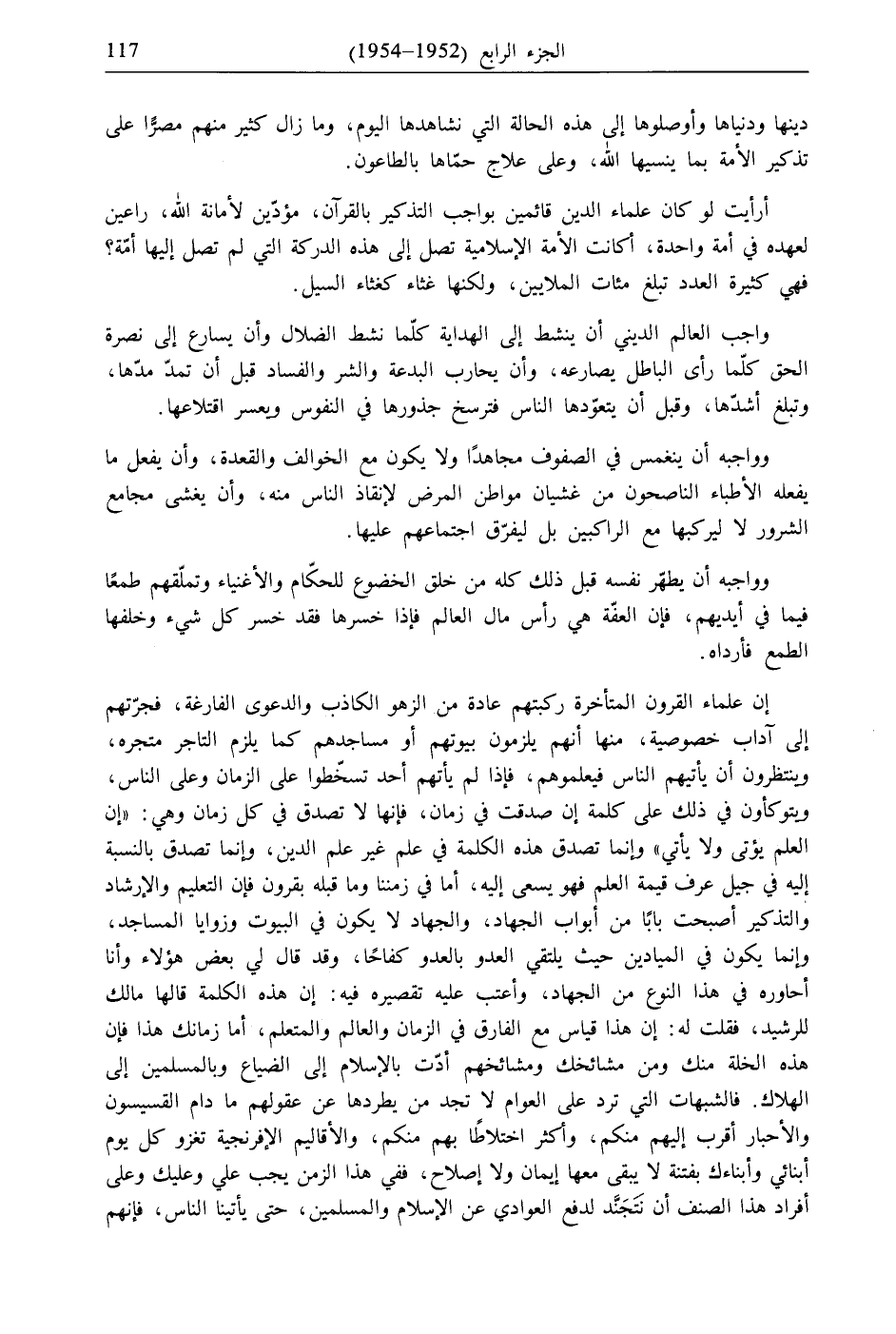 إن علماء القرون المتأخرة ركبتهم عادة من الزهو الكاذب والدعوى الفارغة، فجرّتهم إلى آداب خصوصية، منها أنهم يلزمون بيوتهم أو مساجدهم كما يلزم التاجر متجره، وينتظرون أن يأتيهم الناس فيعلموهم، فإذا لم يأتهم أحد تسخّطوا على الزمان وعلى الناس، ويتوكأون في ذلك على كلمة إن صدقت في زمان، فإنها لا تصدق في كل زمان وهي: "إن العلم يؤتى ولا يأتي" وإنما تصدق هذه الكلمة في علم غير علم الدين، وإنما تصدق بالنسبة إليه في جيل عرف قيمة العلم فهو يسعى إليه، أما في زمننا وما قبله بقرون فإن التعليم والإرشاد والتذكير أصبحت بابًا من أبواب الجهاد، والجهاد لا يكون في البيوت وزوايا المساجد، وإنما يكون في الميادين حيث يلتقي العدو بالعدو كفاحًا، وقد قال لي بعض هؤلاء وأنا أحاوره في هذا النوع من الجهاد، وأعتب عليه تقصيره فيه: إن هذه الكلمة قالها مالك للرشيد، فقلت له: إن هذا قياس مع الفارق في الزمان والعالم والمتعلم، أما زمانك هذا فإن هذه الخلة منك ومن مشائخك ومشائخهم أدّت بالإسلام إلى الضياع وبالمسلمين إلى الهلاك. فالشبهات التي ترد على العوام لا تجد من يطردها عن عقولهم ما دام القسيسون والأحبار أقرب إليهم منكم، وأكثر اختلاطًا بهم منكم، والأقاليم الإفرنجية تغزو كل يوم أبنائي وأبناءك بفتنة لا يبقى معها إيمان ولا إصلاح، ففي هذا الزمن يجب علي وعليك وعلى أفراد هذا الصنف أن نتَجَنَّد لدفع العوادي عن الإسلام والمسلمين، حتى يأتينا الناس، فإنهم