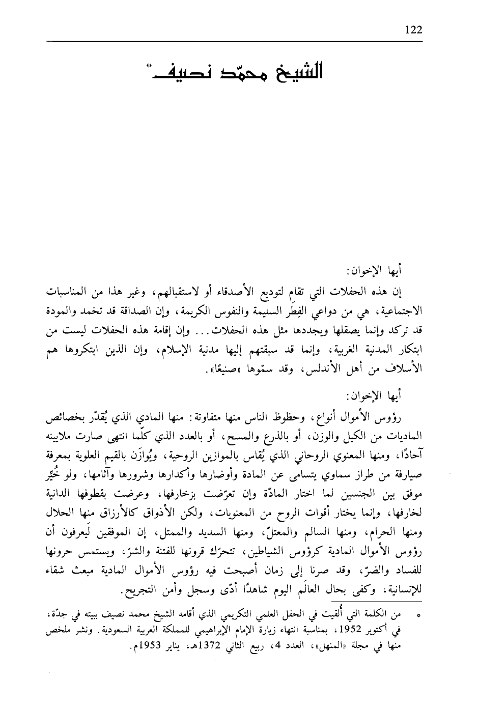 * من الكلمة التي أُلقيت في الحفل العلمي التكريمي الذي أقامه الشيخ محمد نصيف ببيته في جدّة، في أكتوبر 1952، بمناسبة انتهاء زيارة الإمام الإبراهيمي للمملكة العربية السعودية. ونشر ملخص منها في مجلة "المنهل"، العدد 4، ربيع الثاني 1372هـ، يناير 1953م.