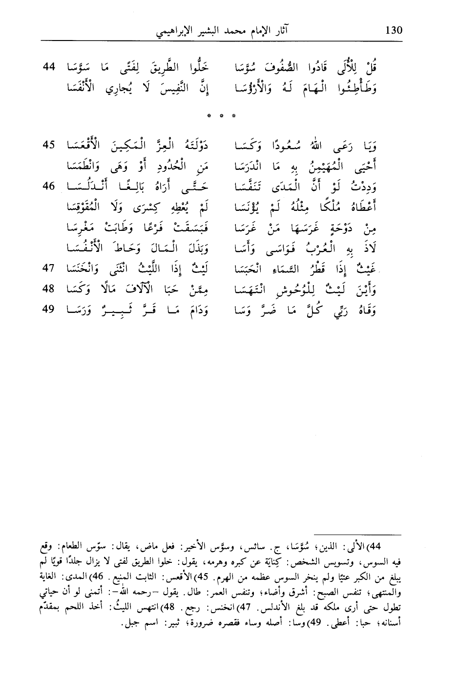 44) الألى: الذين؛ سُوَّسَا، ج. سائس، وسوَّس الأخير: فعل ماض، يقال: سوّس الطعام: وقع فيه السوس، وتسويس الشخص: كِنايَة عن كبره وهرمه، يقول: خلوا الطريق لفتى لا يزال جلدًا قويًا لم يبلغ من الكبر عتيًا ولم ينخر السوس عظمه من الهرم.