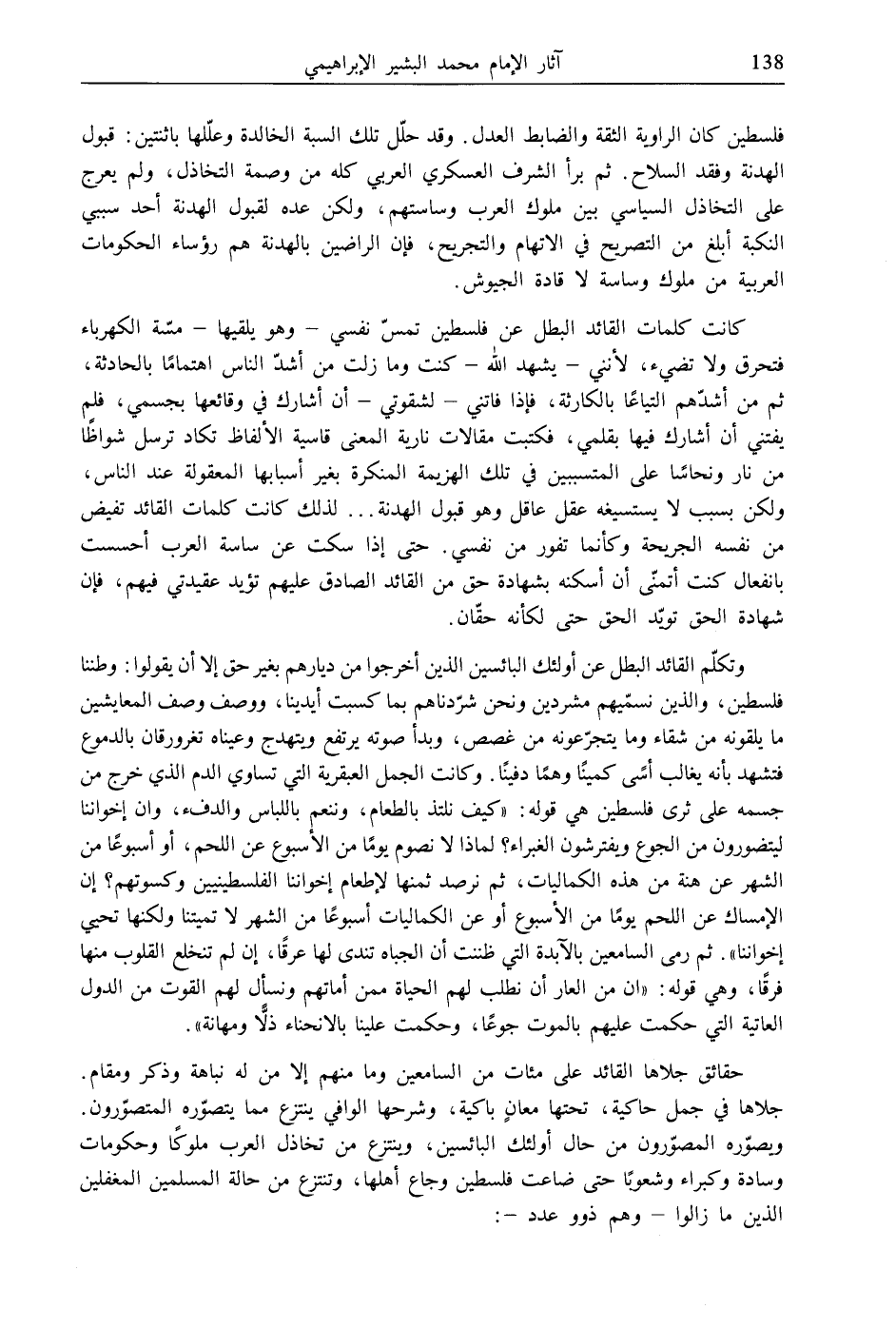 حقائق جلاها القائد على مئات من السامعين وما منهم إلا من له نباهة وذكر ومقام. جلاها في جمل حاكية، تحتها معانٍ باكية، وشرحها الوافي ينتزع مما يتصوّره المتصوّرون. ويصوّره المصوّرون من حال أولئك البائسين، وينتزع من تخاذل العرب ملوكًا وحكومات وسادة وكبراء وشعوبًا حتى ضاعت فلسطين وجاع أهلها، وتنتزع من حالة المسلمين المغفلين الذين ما زالوا- وهم ذوو عدد-: