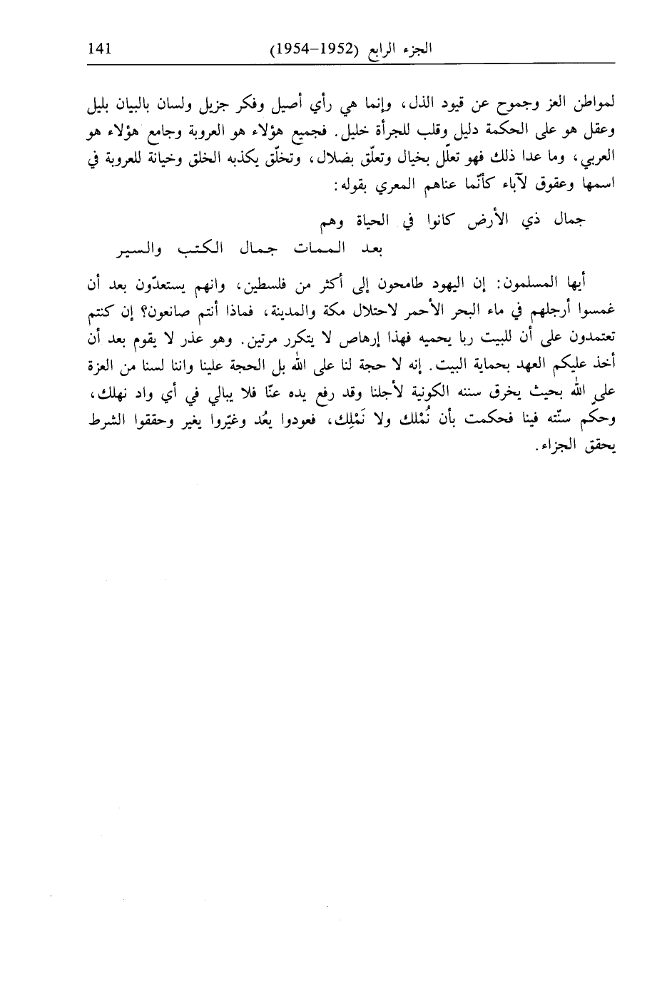 أيها المسلمون: إن اليهود طامحون إلى أكثر من فلسطين، وإنهم يستعدّون بعد أن غمسوا أرجلهم في ماء البحر الأحمر لاحتلال مكة والمدينة، فماذا أنتم صانعون؟ إن كنتم تعتمدون على أن للبيت ربا يحميه فهذا إرهاص لا يتكرر مرتين. وهو عذر لا يقوم بعد أن أخذ عليكم العهد بحماية البيت. إنه لا حجة لنا على الله بل الحجة علينا وإننا لسنا من العزة على الله بحيث يخرق سننه الكونية لأجلنا وقد رفع يده عنا فلا يبالي في أي واد نهلك، وحكّم سنّته فينا فحكمت بأن نُمْلك ولا نَمْلِك، فعودوا يعُد وغيّروا يغير وحققوا الشرط يحقق الجزاء.