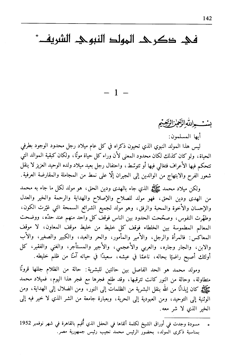 * مسودة وجدت في أوراق الشيخ لكلمة ألقاها في الحفل الذي أُقيم بالقاهرة في شهر نوفمبر 1952 بمناسبة ذكرى المولد، بحضور الرئيس محمد نجيب رئيس جمهورية مصر.