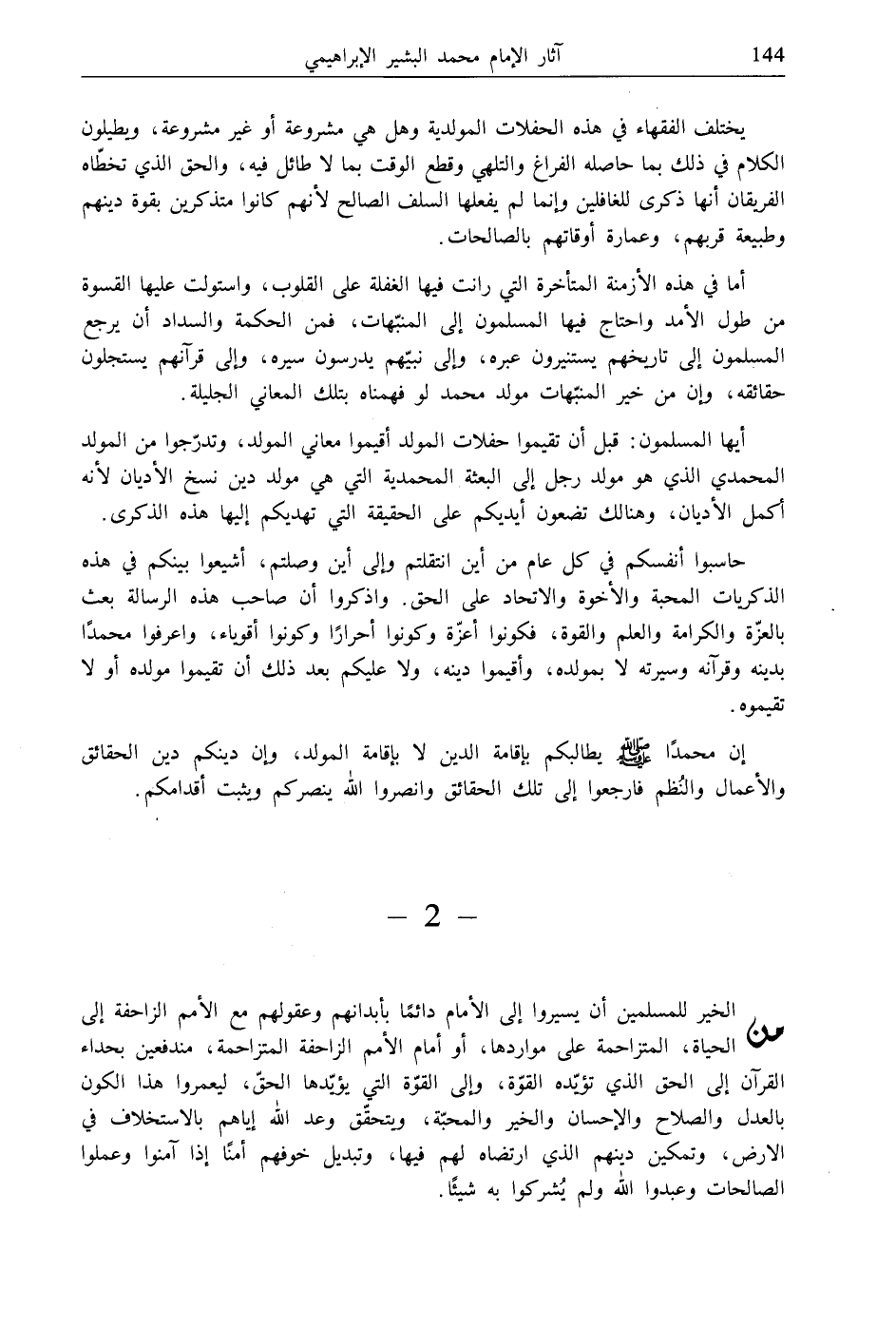 حاسبوا أنفسكم في كل عام من أين انتقلتم وإلى أين وصلتم، أشيعوا بينكم في هذه الذكريات المحبة والأخوة والاتحاد على الحق. واذكروا أن صاحب هذه الرسالة بعث بالعزّة والكرامة والعلم والقوة، فكونوا أعزّة وكونوا أحرارًا وكونوا أقوياء، واعرفوا محمدًا بدينه وقرآنه وسيرته لا بمولده، وأقيموا دينه، ولا عليكم بعد ذلك أن تقيموا مولده أو لا تقيموه.