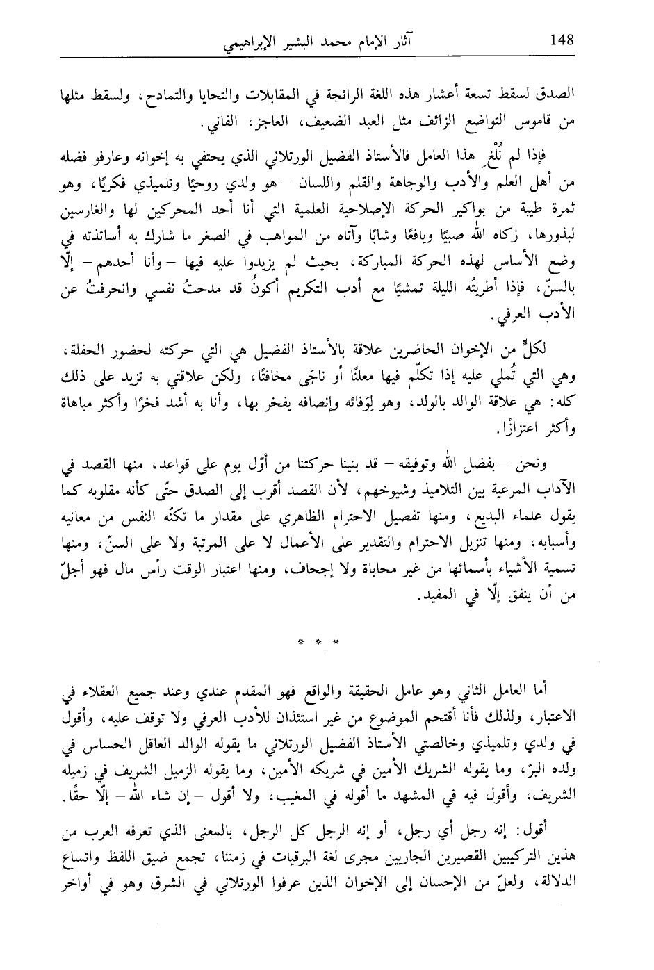 فإذا لم نُئغِ هذا العامل فالأستاذ الفضيل الورتلاني الذي يحتفي به إخوانه وعارفو فضله من أهل العلم والأدب والوجاهة والقلم واللسان- هو ولدي روحيًا وتلميذي فكريًا، وهو ثمرة طيبة من بواكير الحركة الإصلاحية العلمية التي أنا أحد المحركين لها والغارسين لبذورها، زكاه الله صبيًا ويافعًا وشابًا وآتاه من المواهب في الصغر ما شارك به أساتذته في وضع الأساس لهذه الحركة المباركة، بحيث لم يزيدوا عليه فيها- وأنا أحدهم- إلّا بالسنّ، فإذا أطريته الليلة تمشيًا مع أدب التكريم أكون قد مدحت نفسي وانحرفت عن الأدب العرفي.