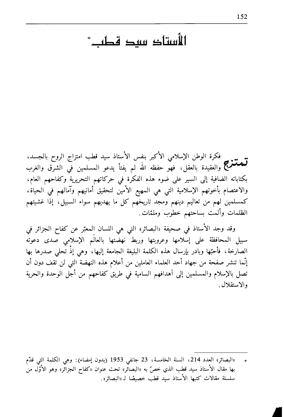 * «البصائر» العدد 214، السنة الخامسة، 23 جانفي 1953 (بدون إمضاء): وهي الكلمة التي قدّم بها مقال الأستاذ سيد قطب الذي خصّ به «البصائر» تحت عنوان "كفاح الجزائر" وهو الأوّل من سلسلة مقالات كتبها الأستاذ سيد قطب خصيصًا لـ «البصائر».