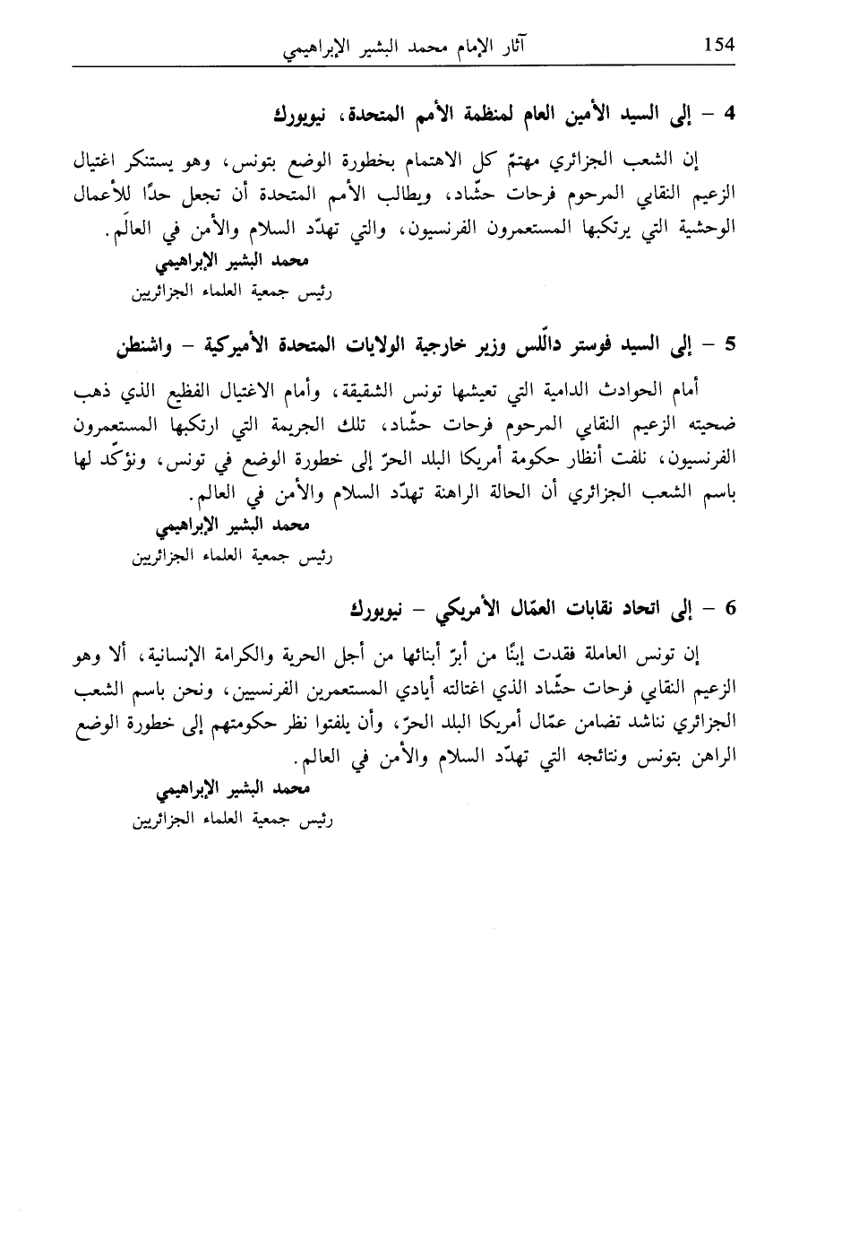 أمام الحوادث الدامية التي تعيشها تونس الشقيقة، وأمام الاغتيال الفظيع الذي ذهب ضحيته الزعيم النقافي المرحوم فرحات حشّاد، تلك الجريمة التي ارتكبها المستعمرون الفرنسيون، نلفت أنظار حكومة أمريكا البلد الحرّ إلى خطورة الوضع في تونس، ونؤكّد لها باسم الشعب الجزائري أن الحالة الراهنة تهدّد السلام والأمن في العالم.