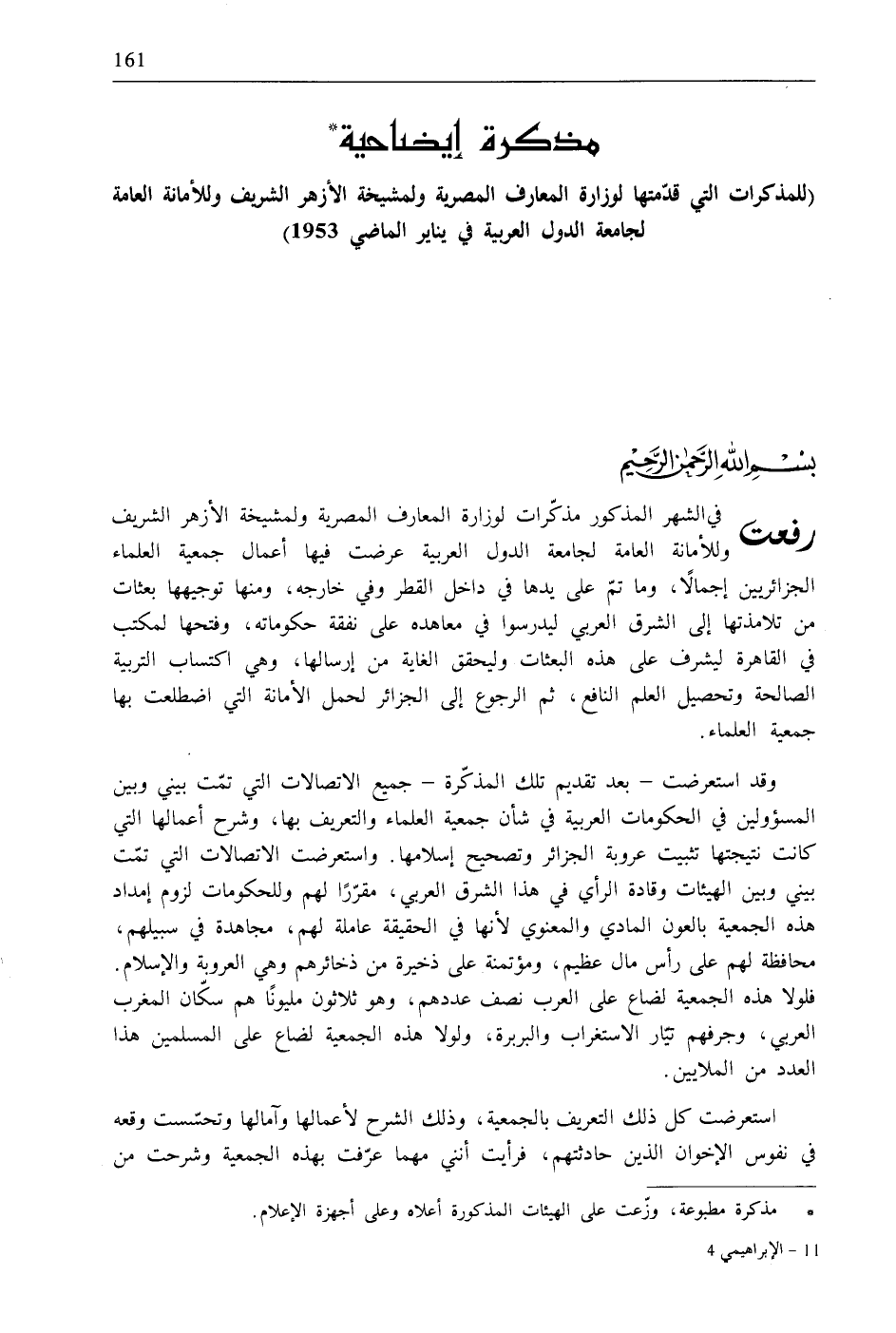 وقد استعرضت- بعد تقديم تلك المذكرة- جميع الاتصالات التي تمّت بيني وبين المسؤولين في الحكومات العربية في شأن جمعية العلماء والتعريف بها، وشرح أعمالها التي كانت نتيجتها تثبيت عروبة الجزائر وتصحيح إسلامها. واستعرضت الاتصالات التي تمت بيني وبين الهيئات وقادة الرأي في هذا الشرق العربي، مقرّرًا لهم وللحكومات لزوم إمداد هذه الجمعية بالعون المادي والمعنوي لأنها في الحقيقة عاملة لهم، مجاهدة في سبيلهم، محافظة لهم على رأس مال عظيم، ومؤتمنة على ذخيرة من ذخائرهم وهي العروبة والإسلام. فلولا هذه الجمعية لضاع على العرب نصف عددهم، وهو ثلاثون مليونًا هم سكّان المغرب العربي، وجرفهم تيّار الاستغراب والبربرة، ولولا هذه الجمعية لضاع على المسلمين هذا العدد من الملايين.