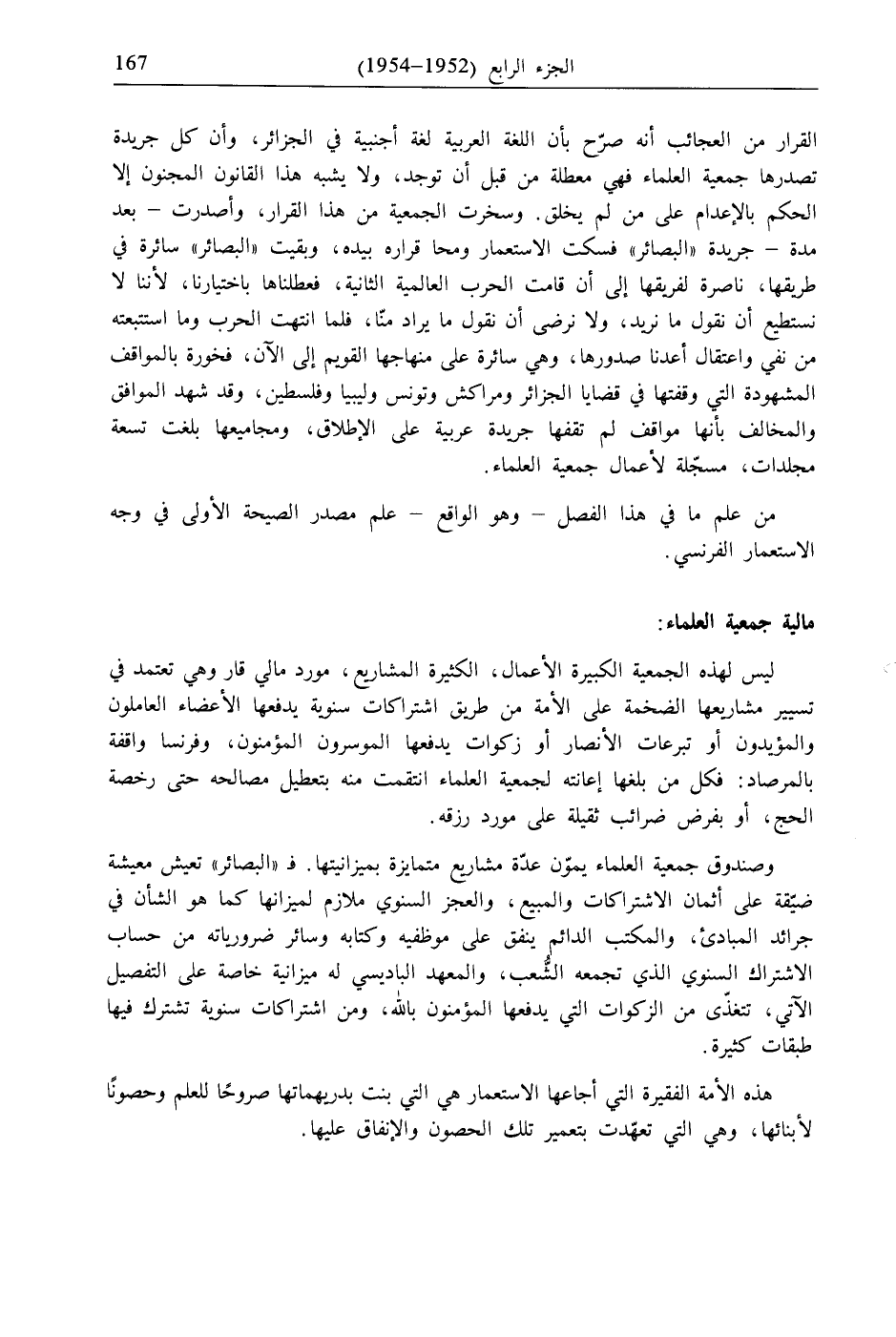 القرار من العجائب أنه صرّح بأن اللغة العربية لغة أجنبية في الجزائر، وأن كل جريدة تصدرها جمعية العلماء فهي معطلة من قبل أن توجد، ولا يشبه هذا القانون المجنون إلا الحكم بالإعدام على من لم يخلق. وسخرت الجمعية من هذا القرار، وأصدرت- بعد مدة- جريدة «البصائر» فسكت الاستعمار ومحا قراره بيده، وبقيت «البصائر» سائرة في طريقها، ناصرة لفريقها إلى أن قامت الحرب العالمية الثانية، فعطلناها باختيارنا، لأننا لا نستطيع أن نقول ما نريد، ولا نرضى أن نقول ما يراد منّا، فلما انتهت الحرب وما استتبعته من نفي واعتقال أعدنا صدورها، وهي سائرة على منهاجها القويم إلى الآن، فخورة بالمواقف المشهودة التي وقفتها في قضايا الجزائر ومراكش وتونس وليبيا وفلسطين، وقد شهد الموافق والمخالف بأنها مواقف لم تقفها جريدة عربية على الإطلاق، ومجاميعها بلغت تسعة مجلدات، مسجّلة لأعمال جمعية العلماء.