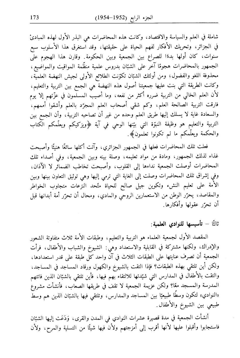 شاملة في العلم والسياسة والاقتصاد، وكانت هذه المحاضرات هي البذر الأول لهذه المبادئ في الجزائر، وتحريك الأفكار لفهم الحياة على حقيقتها، وقد استغرق هذا الأسلوب سبع سنوات، كان أولها بدءًا للصراع بين الجمعية وبين الحكومة. وقارن هذا الهجوم على الجمهور بالمحاضرات هجومًا آخر على الشبّان بدروس علمية منظّمة المواقيت والمواضيع، محذوفة اللغو والفضول؛ ومن أولئك الشبّان تكوّنت الطلائع الأولى لجيش النهضة العلمية، وكانت الطريقة التي بنت عليها جمعيتنا أصول هذه النهضة هي الجمع بين التربية والتعليم، لأن العلم الخالي من التربية ضرره أكثر من نفعه، وما أصيب المسلمون في عزّتهم إلا يوم فارقت التربية الصالحة العلم، وكم شقي أصحاب العلم المجرّد بالعلم وأشقوا أممهم، والسعادة غاية لا يسلك إليها طريق العلم وحده من غير أن تصاحبه التربية، وأن الجمع بين التربية والتعليم هو وظيفة النبوّة التي بيّنها الوحي في آية {وَيُزَكِّيكُمْ وَيُعَلِّمُكُمُ ائكِتَابَ وَائحِكْمَةَ وَيُعَلِّمُكُمْ مَا لَمْ تَكُونُوا تَعْلَمُونَ}.