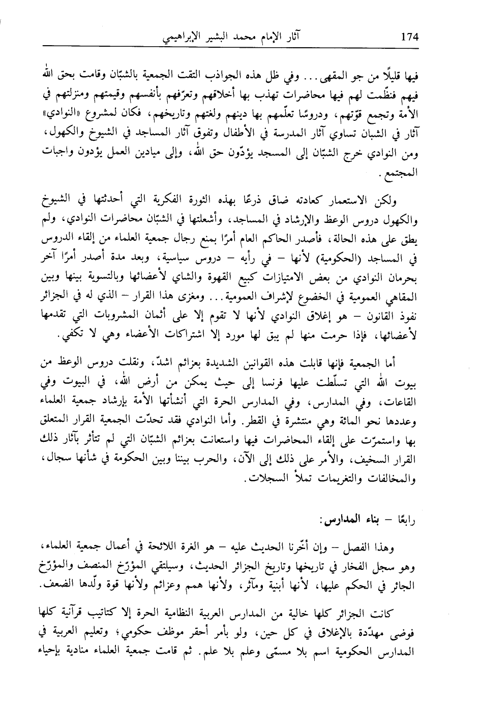 أما الجمعية فإنها قابلت هذه القوانين الشديدة بعزائم أشدّ، ونقلت دروس الوعظ من بيوت الله التي تسلّطت عليها فرنسا إلى حيث يمكن من أرض الله، في البيوت وفي القاعات، وفي المدارس، وفي المدارس الحرة التي أنشأتها الأمة بإرشاد جمعية العلماء وعددها نحو المائة وهي منتشرة في القطر. وأما النوادي فقد تحدّت الجمعية القرار المتعلق بها واستمرّت على إلقاء المحاضرات فيها واستعانت بعزائم الشبّان التي لم تتأثر بآثار ذلك القرار السخيف، والأمر على ذلك إلى الآن، والحرب بيننا وبين الحكومة في شأنها سجال، والمخالفات والتغريمات تملأ السجلات.