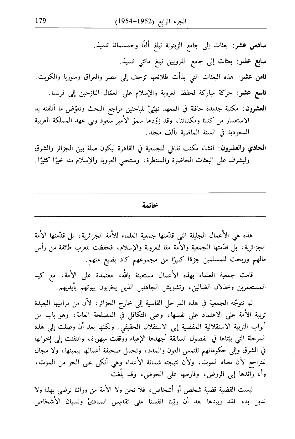 هذه هي الأعمال الجليلة التي قدّمتها جمعية العلماء للأمة الجزائرية، بل قدّمتها الأمة الجزائرية، بل قدّمتها الجمعية والأمة معًا للعروبة والإسلام، فحفظت للعرب طائفة من رأس مالهم وربحت للمسلمين جزءًا كبيرًا من مجموعهم كاد يضيع منهم.