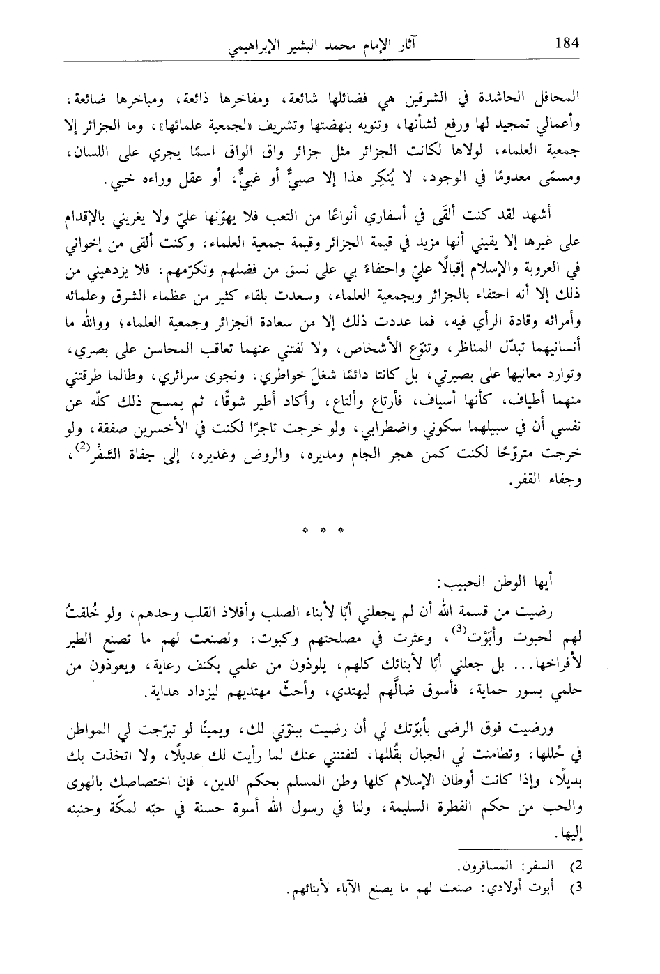 أشهد لقد كنت ألقَى في أسفاري أنواعًا من التعب فلا يهوّنها عليّ ولا يغريني بالإقدام على غيرها إلا يقيني أنها مقلد في قيمة الجزائر وقيمة جمعية العلماء، وكنت ألقى من إخواني في العروبة والإسلام إقبالًا عليّ واحتفاءً بي على نسق من فضلهم وتكرّمهم، فلا يزدهيني من ذلك إلا أنه احتفاء بالجزائر وبجمعية العلماء، وسعدت بلقاء كثير من عظماء الشرق وعلمائه وأمرائه وقادة الرأي فيه، فما عددت ذلك إلا من سعادة الجزائر وجمعية العلماء، ووالله ما أنسانيهما تبدّل المناظر، وتنوّع الأشخاص، ولا لفتني عنهما تعاقب المحاسن على بصري، وتوارد معانيها على بصيرتي، بل كانتا دائمًا شغلَ خواطري، ونجوى سرائري، وطالما طرقتني منهما أطياف، كأنها أسياف، فأرتاع وألتاع، وأكاد أطير شوقًا، ثم يمسح ذلك كلّه عن نفسي أن في سبيلهما سكوني واضطرابي، ولو خرجت تاجرًا لكنت في الأخسرين صفقة، ولو خرجت متروّحًا لكنت كمن هجر الجام ومديره، والروض وغديره، إلى جفاة السَّفْر (2)، وجفاء القفر.