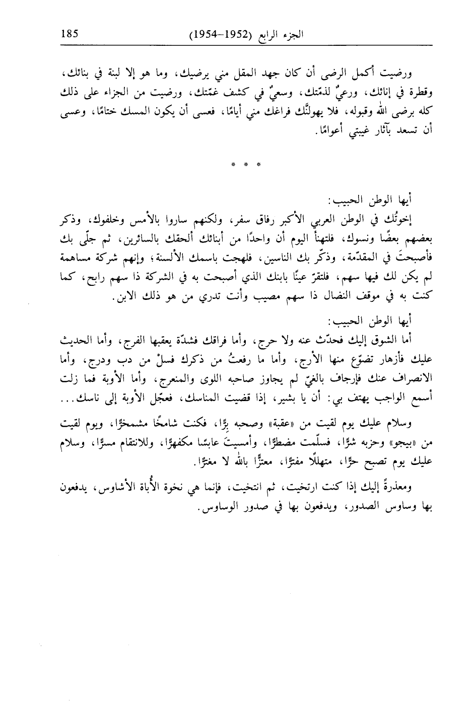 أما الشوق إليك فحدّث عنه ولا حرج، وأما فراقك فشدّة يعقبها الفرج، وأما الحديث عليك فأزهار تضوّع منها الأرج، وأما ما رفعتُ من ذكرك فسئ من دب ودرج، وأما الانصراف عنك فإرجاف بالغيّ لم يجاوز صاحبه اللوى والمنعرج، وأما الأوبة فما زلت أسمع الواجب يهتف بي: أن يا بشير، إذا قضيت المناسك، فعجّل الأوبة إلى ناسك ... وسلام عليك يوم لقيت من "عقبة" وصحبه بِرًّا، فكنت شامخًا مشمخرًّا، ويوم لقيت من "بيجو" وحزبه سرًّا، فسلّمت مضطرًّا، وأمسيتَ عابسًا مكفهرًّا، وللانتقام مسرًّا، وسلام عليك يوم تصبح حرًّا، متهللًا مفترًّا، معتزًّا بالله لا مغترًّا.
