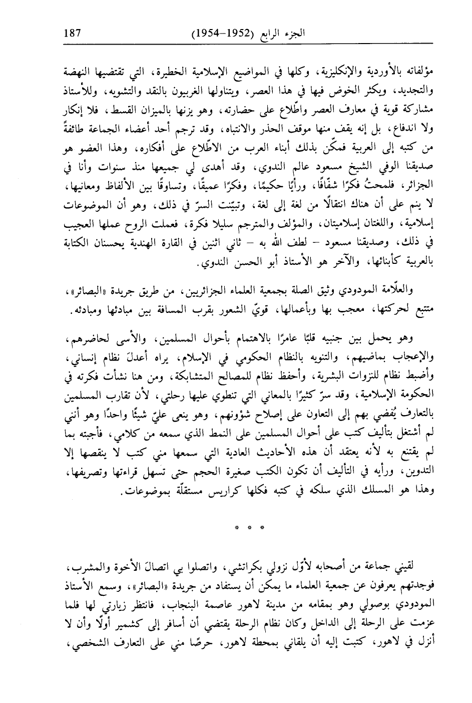 والعلّامة المودودي وثيق الصلة بجمعية العلماء الجزائريين، من طريق جريدة «البصائر»، متتبع لحركتها، معجب بها وبأعمالها، قويّ الشعور بقرب المسافة بين مبادئها ومبادئه. وهو يحمل بين جنبيه قلبًا عامرًا بالاهتمام بأحوال المسلمين، والأسى لحاضرهم، والإعجاب بماضيهم، والتنويه بالنظام الحكومي في الإسلام، يراه أعدلَ نظام إنساني، وأضبط نظام للنزوات البشرية، وأحفظ نظام للمصالح المتشابكة، ومن هنا نشأت فكرته في الحكومة الإسلامية، وقد سرّ كثيرًا بالمعاني التي تنطوي عليها رحلتي، لأن تقارب المسلمين بالتعارف يُفضي بهم إلى التعاون على إصلاح شؤونهم، وهو ينعى عليّ شيئًا واحدًا وهو أنني لم أشتغل بتأليف كتب على أحوال المسلمين على النمط الذي سمعه من كلامي، فأجبته بما لم يقتنع به لأنه يعتقد أن هذه الأحاديث العادية التي سمعها مني كتب لا ينقصها إلا التدوين، ورأيه في التأليف أن تكون الكتب صغيرة الحجم حتى تسهل قراءتها وتصريفها، وهذا هو المسلك الذي سلكه في كتبه فكلها كراريس مستقلّة بموضوعات.