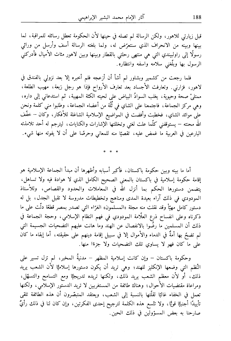 فلما رجعت من كشمير وبشاور لم أشأ أن أزعجه فلم أخبره إلا بعد نزولي بالفندق في لاهور، فزارني. وتعارفت الأجساد بعد تعارف الأرواح فإذا هو رجل رَبعة، مهيب الطلعة، ممتلى صحة وحيوية، يغلب السوادُ البياض على لحيته الكثة المهيبة، ثم استدعاني إلى داره، وهي مركز الجماعة، فاجتمعنا على الشاي في ثُلّة من أعضاء الجماعة، وطلبوا مني كلمة ونحن على موائد الشاي، فخطبت وأفضت في المواضيع الإسلامية الشاغلة للأفكار، وكان- خفّف الله محنته- يستوقفني كلّما علت لغتي وتخللتها الإشارات والكنايات، ليترجم له أحد تلامذته البارعين في العربية ما غمض عليه، تقصيًا منه للمعاني وحرصًا على أن لا يفوته منها شيء.