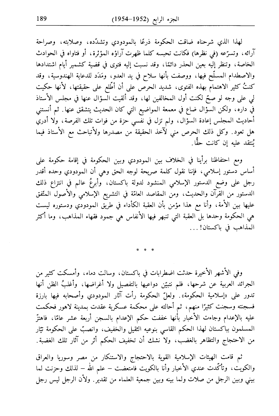 لهذا الذي شرحناه ضاقت الحكومة ذرعًا بالمودودي وتشدّده، وصلابته، وصراحة آرائه، وتسرّعه (في نظرها) فكانت تحبسه كلما ظهرت آراؤه المؤثرة، أو فتاواه في الحوادث الخاصة، وتنظر إليه بعين الحذر دائمًا، وقد نسبت إليه فتوى في قضية كشمير أيام اشتدادها والاصطدام المسلّح فيها، ووصفت بأنها سلاح في يد العدو، ومَدَد للدعاية الهندوسية، وقد كنتُ كثير الاهتمام بهذه الفتوى، شديد الحرص على أن أطّلع على حقيقتها، لأنها حكيت لي على وجه لو صحّ لكنت أول المخالفين لها، وقد ألقيت السؤال عنها في مجلس الأستاذ في داره، ولكن السؤال ضاع في معمعة المواضيع التي كان الحديث يتشقق عنها. ثم أنستني أحاديث المجلس إعادة السؤال، ولم تزل في نفسي حزة من فوات تلك الفرصة، ولا أدري هل تعود. وكل ذلك الحرص مني لآخذ الحقيقة من مصدرها ولأتباحث مع الأستاذ فيما يُنتقد عليه إن كانت حقًّا.