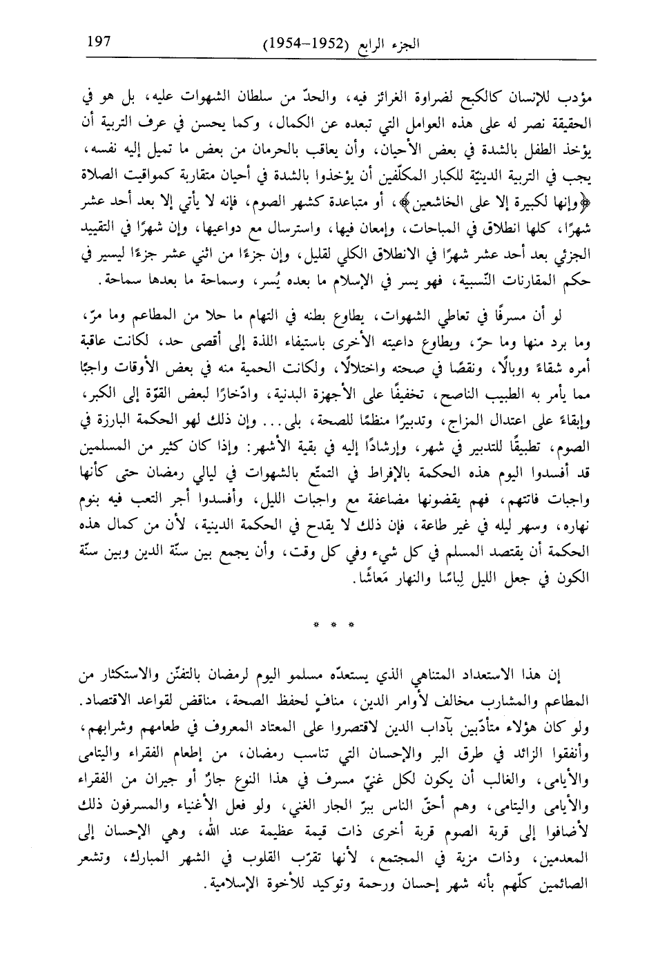 لو أن مسرفًا في تعاطي الشهوات، يطاوع بطنه في التهام ما حلا من المطاعم وما مرّ، وما برد منها وما حرّ، ويطاوع داعيته الأخرى باستيفاء اللذة إلى أقصى حد، لكانت عاقبة أمره شقاءً ووبالًا، ونقصًا في صحته واختلالًا، ولكانت الحمية منه في بعض الأوقات واجبًا مما يأمر به الطبيب الناصح، تخفيفًا على الأجهزة البدنية، وادّخارًا لبعض القوّة إلى الكبر، وإبقاءً على اعتدال المزاج، وتدبيرًا منظمًا للصحة، بلى ... وإن ذلك لهو الحكمة البارزة في الصوم، تطبيقًا للتدبير في شهر، وإرشادًا إليه في بقية الأشهر: وإذا كان كثير من المسلمين قد أفسدوا اليوم هذه الحكمة بالإفراط في التمتّع بالشهوات في ليالي رمضان حتى كأنها واجبات فاتتهم، فهم يقضونها مضاعفة مع واجبات الليل، وأفسدوا أجر التعب فيه بنوم نهاره، وسهر ليله في غير طاعة، فإن ذلك لا يقدح في الحكمة الدينية، لأن من كمال هذه الحكمة أن يقتصد المسلم في كل شيء وفي كل وقت، وأن يجمع بين سنّة الدين وبين سنّة الكون في جعل الليل لِباسًا والنهار مَعاشًا.