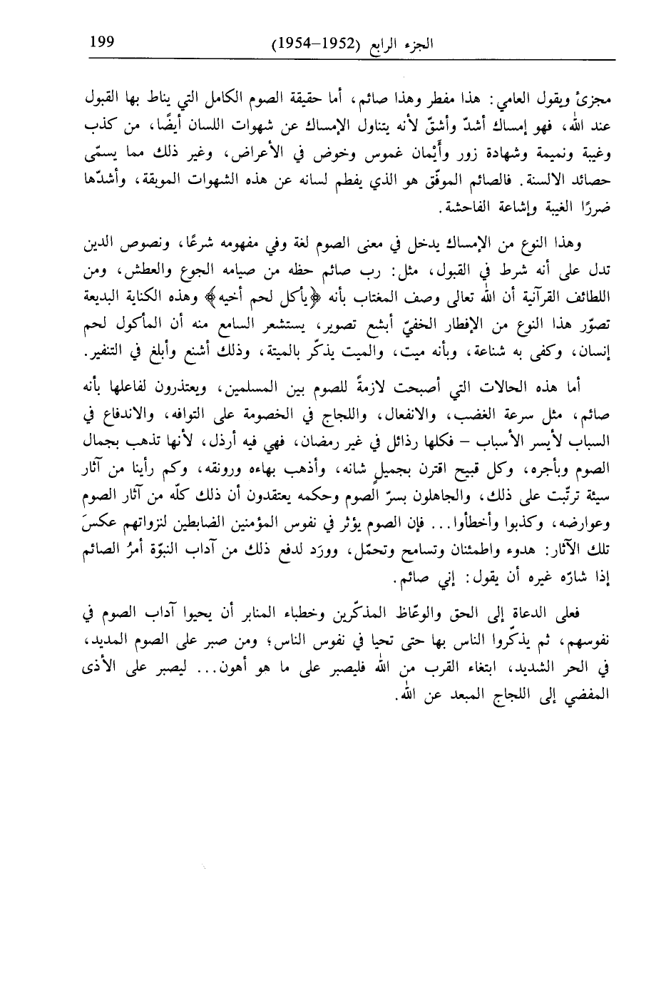 مجزئ ويقول العامي: هذا مفطر وهذا صائم، أما حقيقة الصوم الكامل التي يناط بها القبول عند الله، فهو إمساك أشدّ وأشقّ لأنه يتناول الإمساك عن شهوات اللسان أيضًا، من كذب وغيبة ونميمة وشهادة زور وأَيْمان غموس وخوض في الأعراض، وغير ذلك مما يسمّى حصائد الألسنة. فالصائم الموفّق هو الذي يفطم لسانه عن هذه الشهوات الموبقة، وأشدّها ضررًا الغيبة وإشاعة الفاحشة.