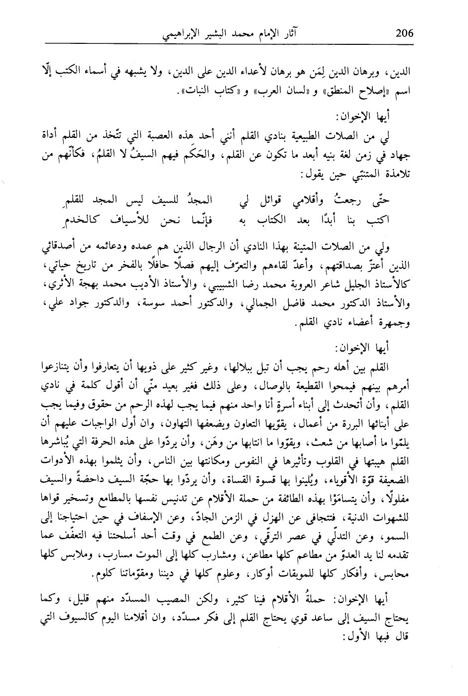 أيها الإخوان: حملةُ الأقلام فينا كثير، ولكن المصيب المسدّد منهم قليل، وكما يحتاج السيف إلى ساعد قوي يحتاج القلم إلى فكر مسدّد، وإن أقلامنا اليوم كالسيوف التي قال فيها الأول: