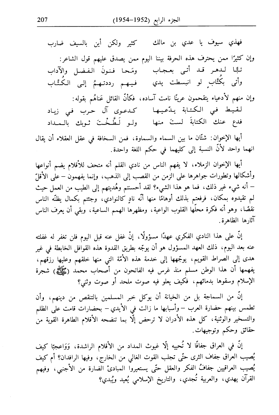 أيها الإخوان الزملاء، لا يفهم الناس من نادي القلم أنه متحف للأقلام يضم أنواعها وأشكالها وتطورات جواهرها على الزمن من القصب إلى الذهب، وإنما يفهمون- على الأقل - أنه شيء غير ذلك، فما هو هذا الشيء؟ لقد أحسنتم وهُديتهم إلى الطيب من العمل حيث لم تقيدوه بمكان، فرفعتم بذلك أوهامًا منها أنّه نادٍ كالنوادي، وجئتم بكمال يظنّه الناس نقصًا، وهو أنه فكرة محلّها القلوب الواعية، ومظهرها الهمم الساعية، وبقي أن يعرف الناس آثارها الظاهرة.