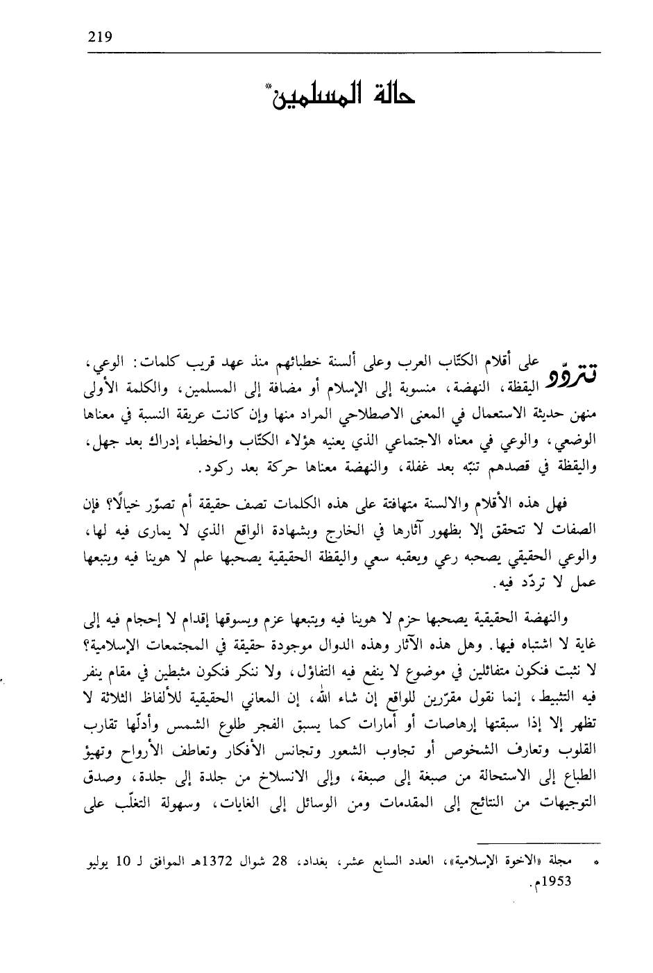 تتردّد على أقلام الكتّاب العرب وعلى ألسنة خطبائهم منذ عهد قريب كلمات: الوعي، اليقظة، النهضة، منسوبة إلى الإسلام أو مضافة إلى المسلمين، والكلمة الأولى منهن حديثة الاستعمال في المعنى الاصطلاحي المراد منها وإن كانت عريقة النسبة في معناها الوضعي، والوعي في معناه الاجتماعى الذي يعنيه هؤلاء الكتّاب والخطباء إدراك بعد جهل، واليقظة في قصدهم تنبّه بعد غفلة، والنهضة معناها حركة بعد ركود.