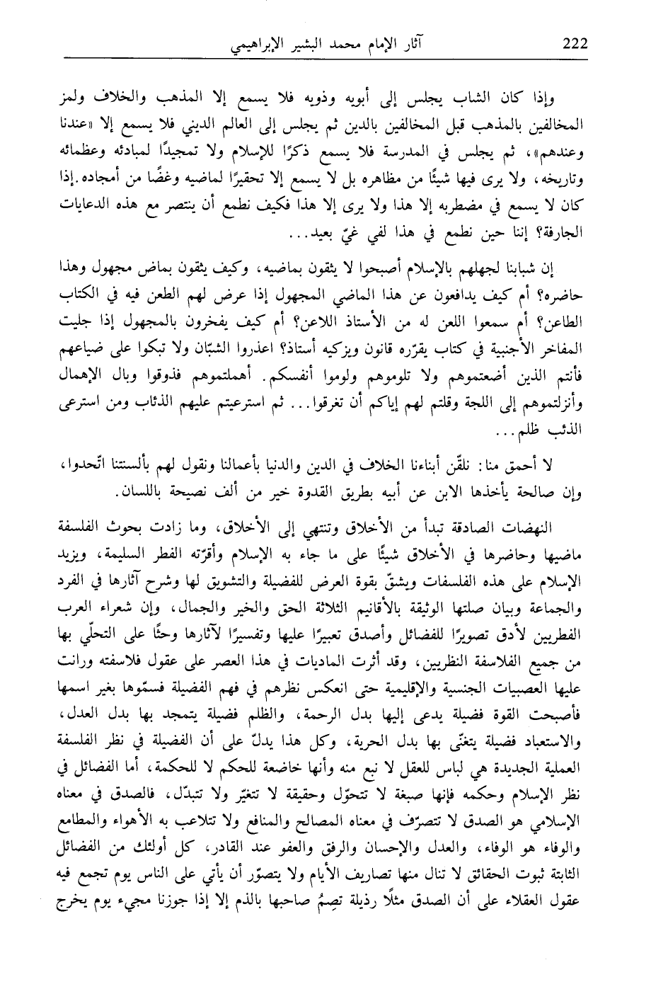 النهضات الصادقة تبدأ من الأخلاق وتنتهي إلى الأخلاق، وما زادت بحوث الفلسفة ماضيها وحاضرها في الأخلاق شيئًا على ما جاء به الإسلام وأقرّته الفطر السليمة، ويزيد الإسلام على هذه الفلسفات ويشقّ بقوة العرض للفضيلة والتشويق لها وشرح آثارها في الفرد والجماعة وبيان صلتها الوثيقة بالأقانيم الثلاثة الحق والخير والجمال، وإن شعراء العرب الفطريين لأدق تصويرًا للفضائل وأصدق تعبيرًا عليها وتفسيرًا لآثارها وحثًا على التحلّي بها من جميع الفلاسفة النظريين، وقد أثرت الماديات في هذا العصر على عقول فلاسفته ورانت عليها العصبيات الجنسية والإقليمية حتى انعكس نظرهم في فهم الفضيلة فسمّوها بغير اسمها فأصبحت القوة فضيلة يدعى إليها بدل الرحمة، والظلم فضيلة يتمجد بها بدل العدل، والاستعباد فضيلة يتغنّى بها بدل الحرية، وكل هذا يدلّ على أن الفضيلة في نظر الفلسفة العملية الجديدة هي لباس للعقل لا نبع منه وأنها خاضعة للحكم لا للحكمة، أما الفضائل في نظر الإسلام وحكمه فإنها صبغة لا تتحوّل وحقيقة لا تتغيّر ولا تتبدّل، فالصدق في معناه الإسلامي هو الصدق لا تتصرّف في معناه المصالح والمنافع ولا تتلاعب به الأهواء والمطامع والوفاء هو الوفاء، والعدل والإحسان والرفق والعفو عند القادر، كل أولئك من الفضائل الثابتة ثبوت الحقائق لا تنال منها تصاريف الأيام ولا يتصوّر أن يأتي على الناس يوم تجمع فيه عقول العقلاء على أن الصدق مثلًا رذيلة تصِمُ صاحبها بالذم إلا إذا جوزنا مجيء يوم يخرج