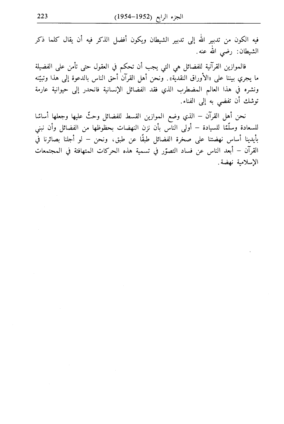 فالموازين القرآنية للفضائل هي التي يجب أن تحكم في العقول حتى تأمن على الفضيلة ما يجري بيننا على "الأوراق النقدية". ونحن أهل القرآن أحق الناس بالدعوة إلى هذا وتبيّنه ونشره في هذا العالم المضطرب الذي فقد الفضائل الإنسانية فانحدر إلى حيوانية عارمة توشك أن تفضي به إلى الفناء.