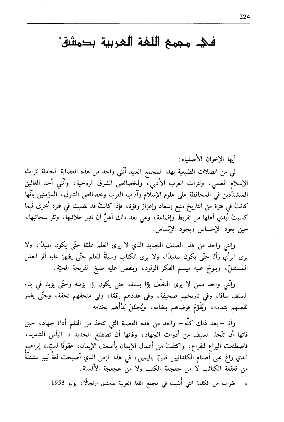 * فقرات من الكلمة التي أُلقيت في مجمع اللغة العربية بدمشق ارتجالًا، يونيو 1953.